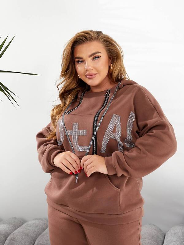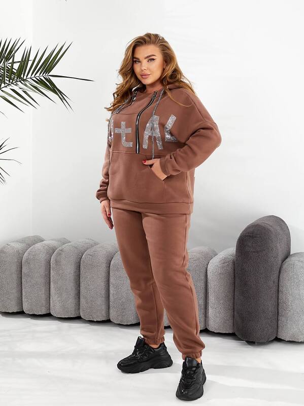 Толстовка свободного кроя выполнена с удобным глубоким капюшоном и декорирована крупными блестящими надписями из камней, что придаёт образу изысканности и лёгкого гламура. Впереди расположен объёмный карман-кенгуру, создающий дополнительное удобство и акцент на спортивном стиле. Брюки прямого фасона с мягкой резинкой на талии и аккуратными манжетами по низу обеспечивают отличную посадку и свободу движений. Костюм создаёт сбалансированный силуэт, подчёркивающий достоинства фигуры, и подойдёт женщинам разных размеров.