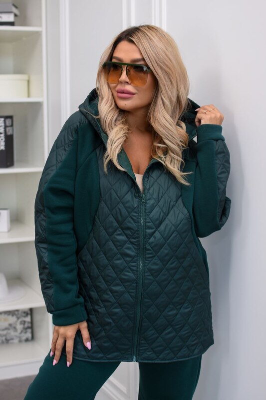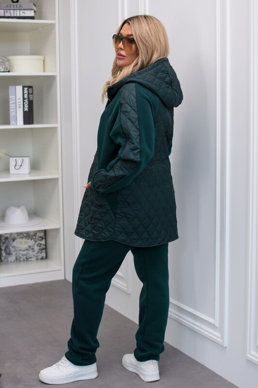 Верх выполнен в виде удобной куртки-олимпийки на молнии с капюшоном и элементами простёжки, что делает модель модной и универсальной. Длина куртки прикрывает бёдра, обеспечивая дополнительный комфорт и защиту от холода. Брюки прямого кроя с поясом на резинке и боковыми карманами обеспечивают удобную посадку и свободу движений, а лаконичный силуэт подчёркивает женственность даже в спортивном образе.