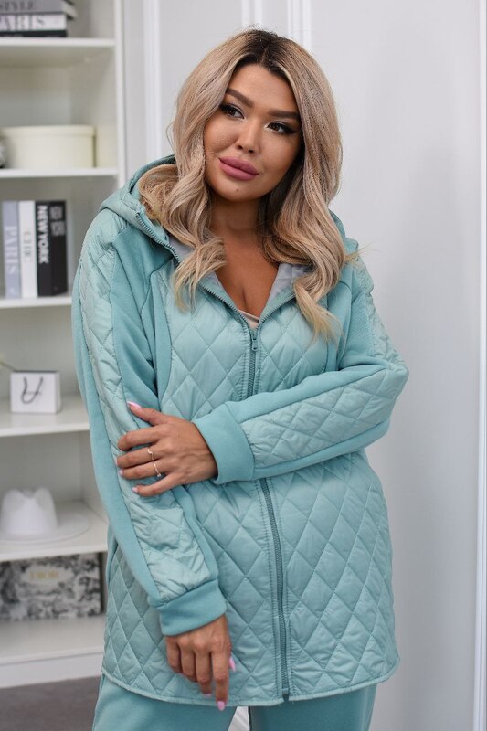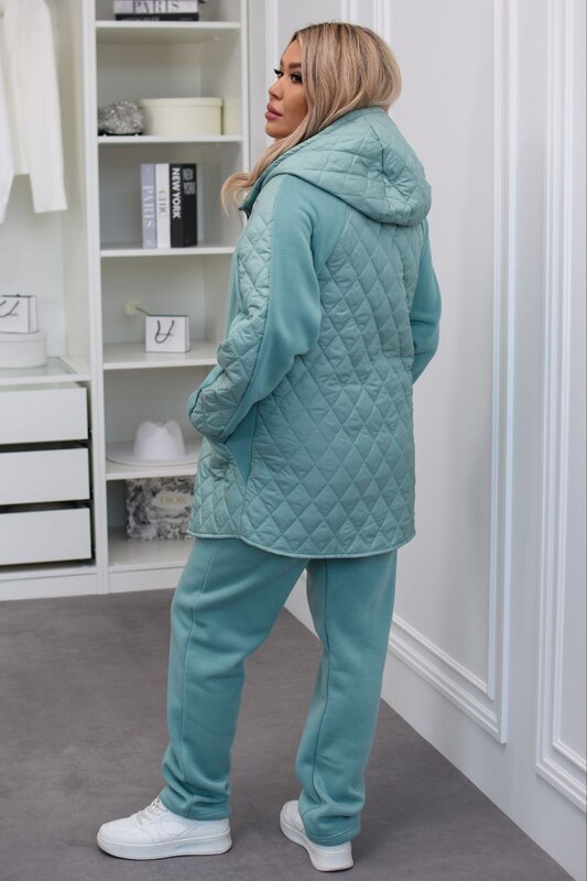Верх выполнен в виде куртки-олимпийки с застёжкой на молнию, удобным капюшоном и вставками из простёганной ткани. Такой дизайн не только добавляет функциональности, но и подчёркивает современный силуэт. Куртка имеет оптимальную длину, прикрывающую бёдра, что делает модель комфортной и визуально гармоничной. Брюки прямого кроя с мягким поясом на резинке и боковыми карманами обеспечивают удобную посадку и свободу движений. Благодаря комбинации фактур и идеальной посадке костюм выглядит женственно и стильно.