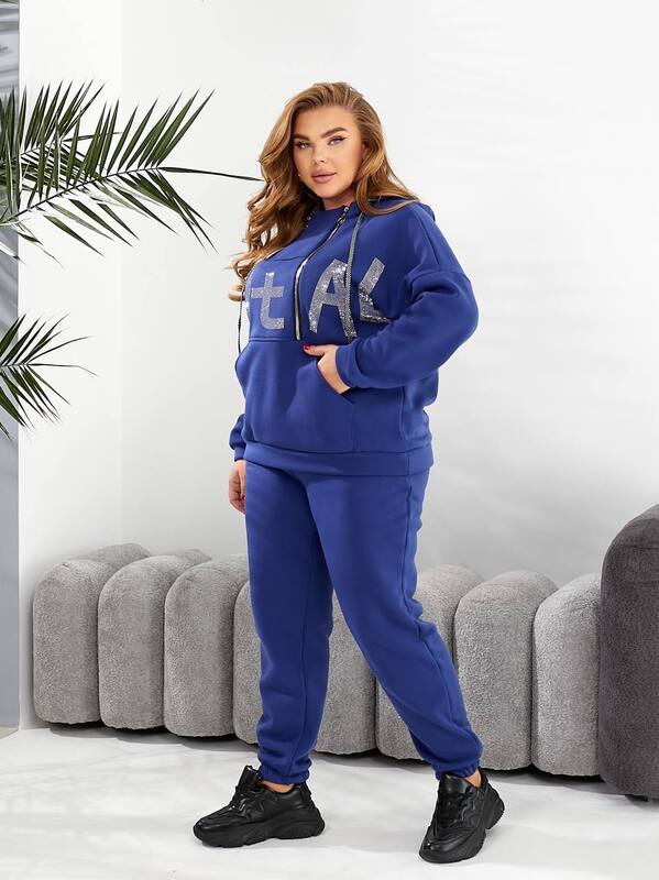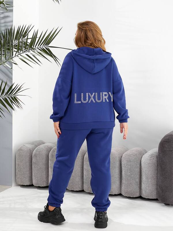 Толстовка свободного кроя с глубоким капюшоном дополнена крупным блестящим декором из камней в виде надписи, который добавляет образу эффектности и современного стиля. Впереди расположен удобный карман-кенгуру, в который можно спрятать руки или мелкие вещи. Брюки прямого фасона с эластичной резинкой на талии и манжетами по низу создают идеальную посадку, подчёркивая фигуру, но не ограничивая движений. Костюм выглядит гармонично, подчёркивая женственность даже в спортивном образе.