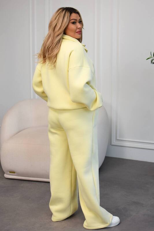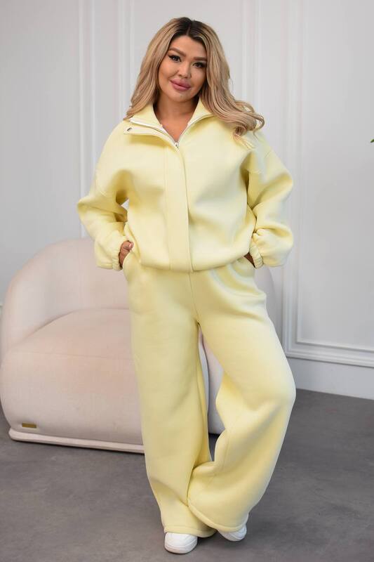 Брюки прямого кроя на резинке с высокой посадкой обеспечивают комфортную посадку и мягко повторяют линию фигуры, не создавая дискомфорта. Благодаря прямому силуэту и плотной ткани костюм визуально вытягивает фигуру, создавая сбалансированный и стройный образ. Модель прекрасно подойдёт женщинам с любым типом фигуры, включая plus size, даря ощущение лёгкости и свободы движений. Флисовый слой внутри делает костюм особенно тёплым, что делает его незаменимым в осенне-зимний период.