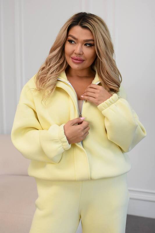 Кофта свободного кроя на молнии с аккуратным воротником-стойкой подчёркивает современный стиль модели и обеспечивает дополнительную защиту от ветра. Рукава на манжетах создают удобную посадку и предотвращают продувание. Свободный фасон не сковывает движений, что делает костюм комфортным для активного отдыха, прогулок или повседневной носки. Молния спереди позволяет легко регулировать уровень комфорта, а практичные боковые карманы добавляют функциональности.