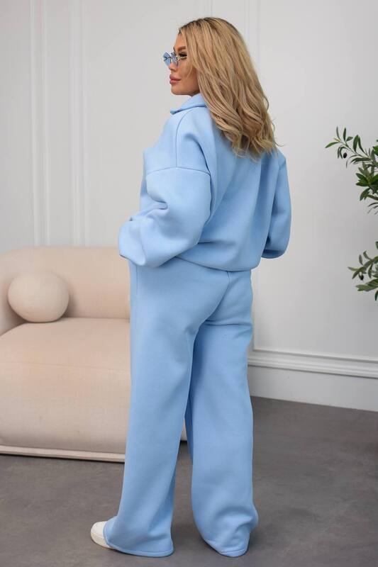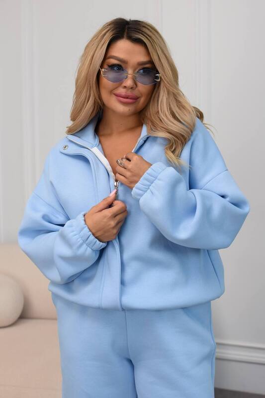 Верх костюма представлен в виде кофты на молнии с воротником-стойкой, создающей аккуратный и современный образ. Свободный крой позволяет чувствовать себя комфортно, а манжеты на рукавах обеспечивают идеальную посадку и защищают от холода. Молния по центру добавляет практичности, позволяя носить изделие как самостоятельно, так и поверх футболок или водолазок. Дизайн лаконичный и универсальный — костюм одинаково хорошо подойдёт для прогулок, повседневного отдыха или путешествий.