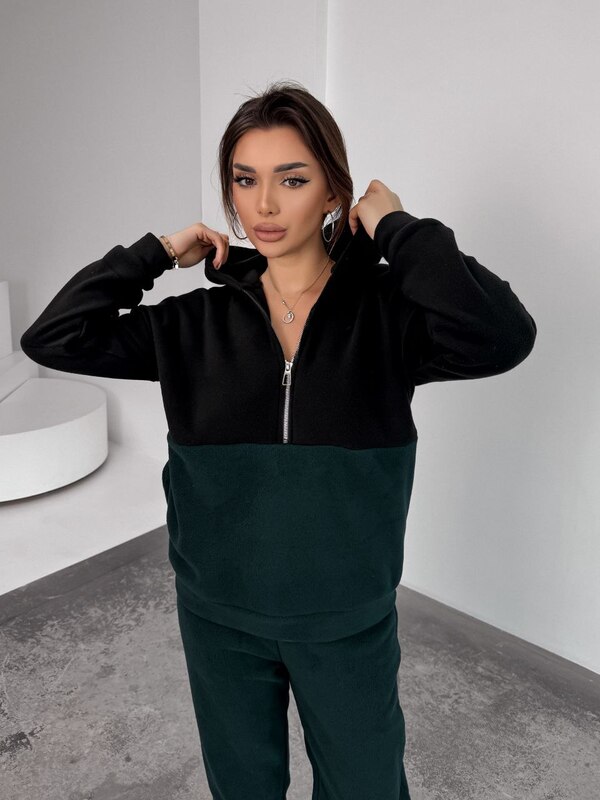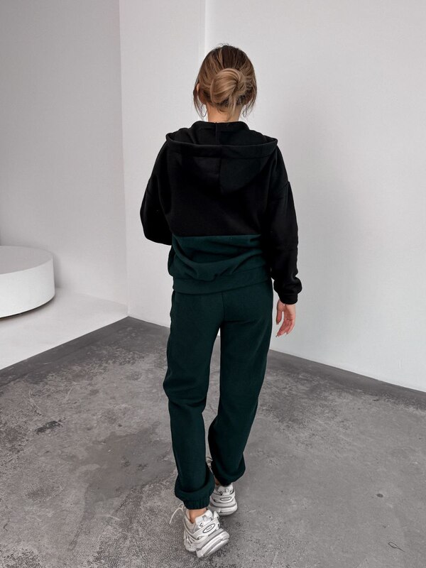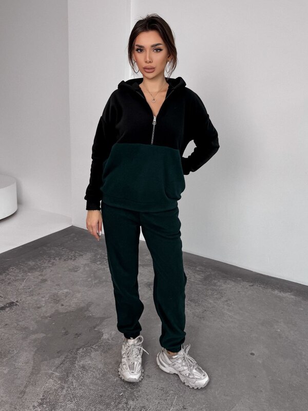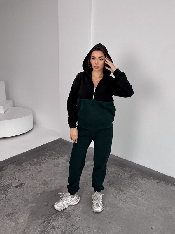 Верх костюма выполнен в виде худи на молнии до груди. Это практичный и универсальный фасон: молния позволяет регулировать степень утепления, а капюшон обеспечивает дополнительную защиту от холода и ветра. Контрастное сочетание глубокого чёрного и насыщенного зелёного оттенка визуально стройнит, подчёркивает фигуру и придаёт образу современный характер. Мягкие манжеты на рукавах удерживают тепло и сохраняют аккуратность кроя, делая худи особенно уютным и функциональным.