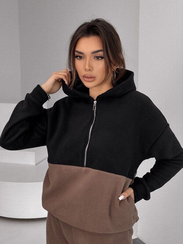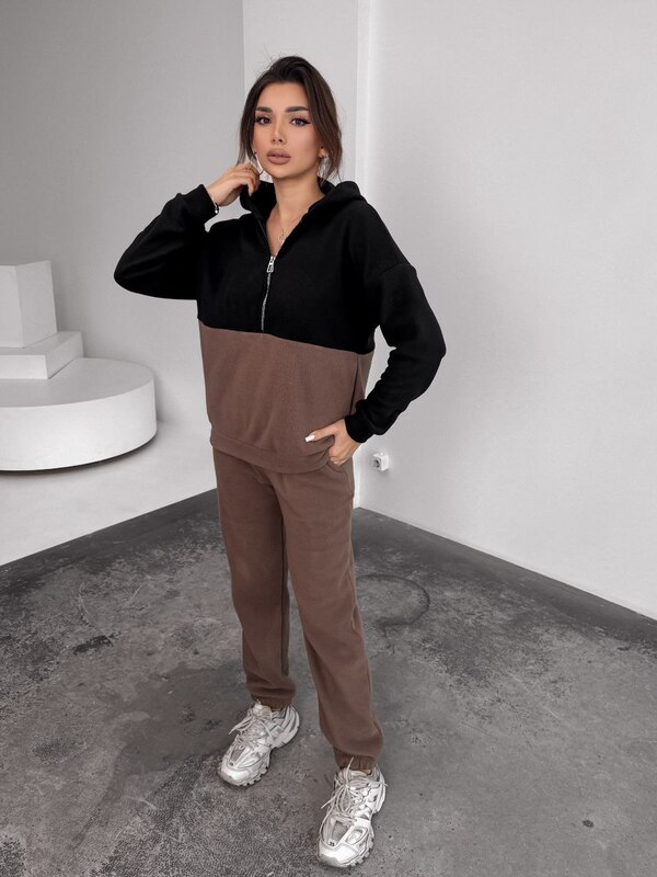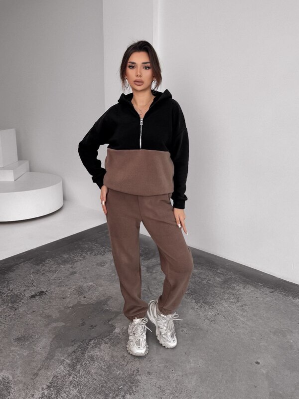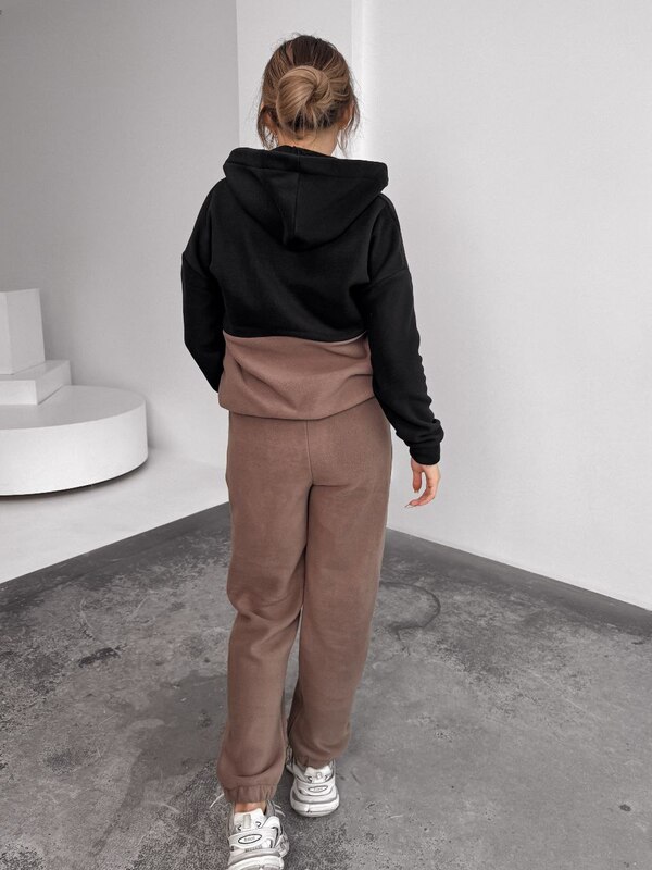 Костюм выполнен в стильном сочетании чёрного и мокко — это спокойная, современная палитра, которая легко сочетается с зимней обувью, куртками и аксессуарами. Такой комплект универсален, практичен и подходит для разных ситуаций: прогулок, лёгких тренировок на свежем воздухе, поездок и повседневной носки.