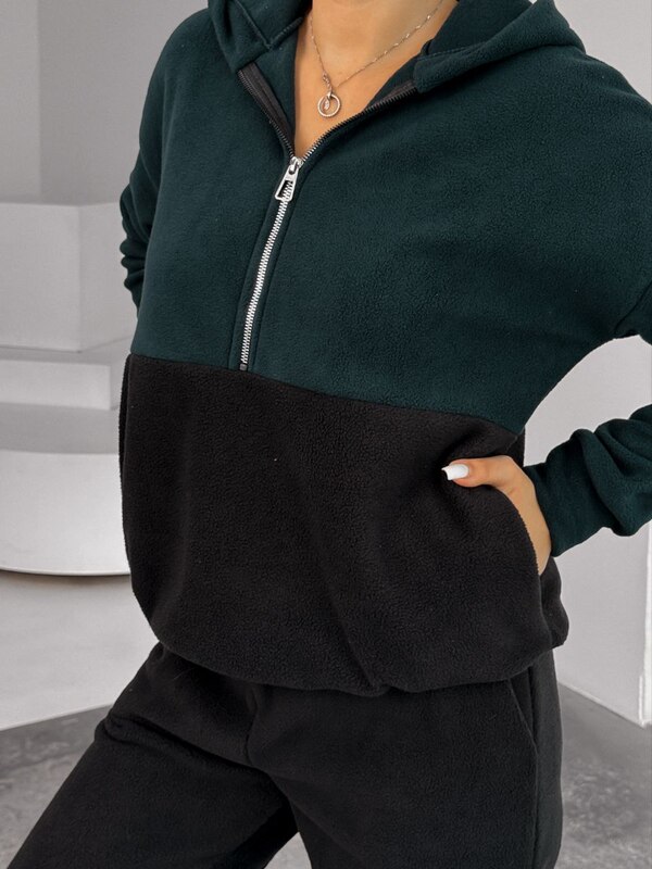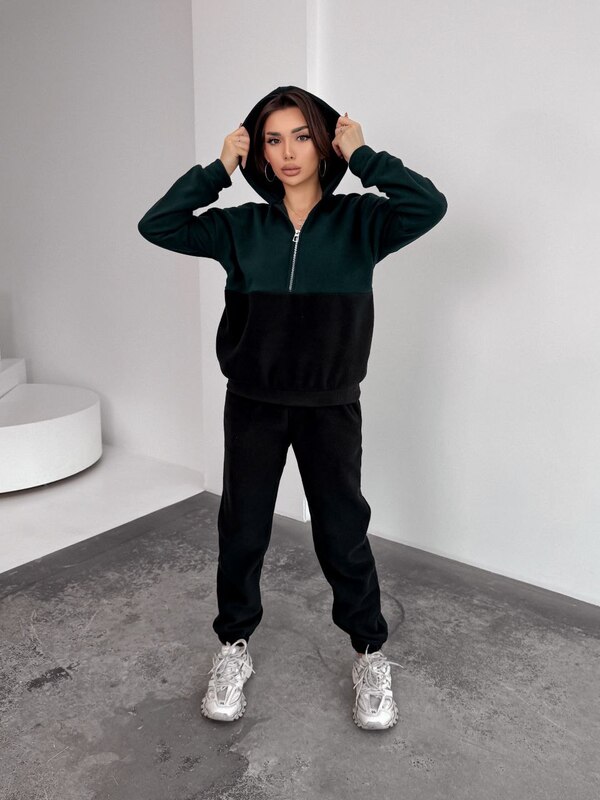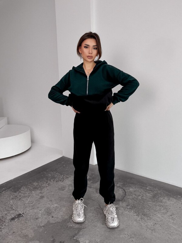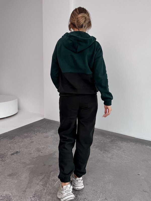Верх костюма выполнен в виде удобного худи с молнией до груди. Этот формат позволяет легко регулировать глубину выреза, обеспечивая максимальный комфорт в зависимости от температуры и активности. Капюшон добавляет защиту от ветра и холода, создаёт уют и подчёркивает спортивный стиль модели. Контрастное сочетание глубокого зелёного оттенка и элегантного чёрного визуально вытягивает силуэт, подчёркивая современность и аккуратность образа. Манжеты на рукавах удерживают тепло и сохраняют форму изделия, делая худи особенно практичным.