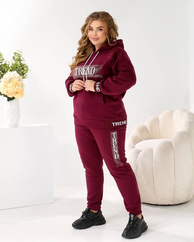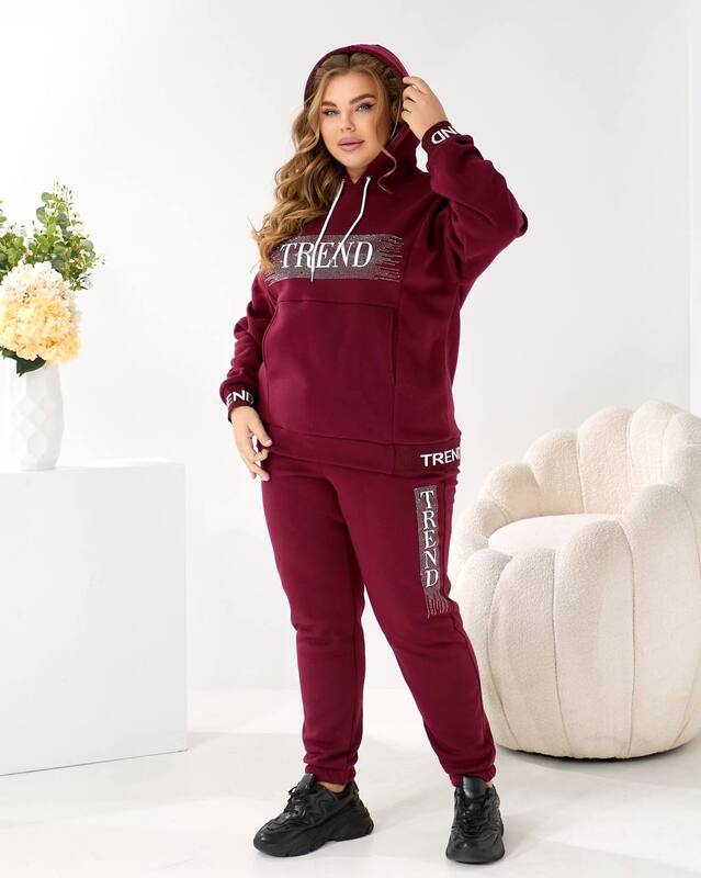 Джоггеры, входящие в комплект, выполнены из той же мягкой утеплённой трехнитки, что и худи. Они имеют комфортную посадку за счёт эластичного пояса, который не давит и мягко адаптируется к фигуре. Манжеты по низу делают силуэт аккуратным, сохраняют тепло и придают образу гармоничность. Боковые декоративные вставки подчёркивают спортивный стиль и визуально добавляют динамики. Брюки остаются тёплыми и удобными даже при длительной носке.