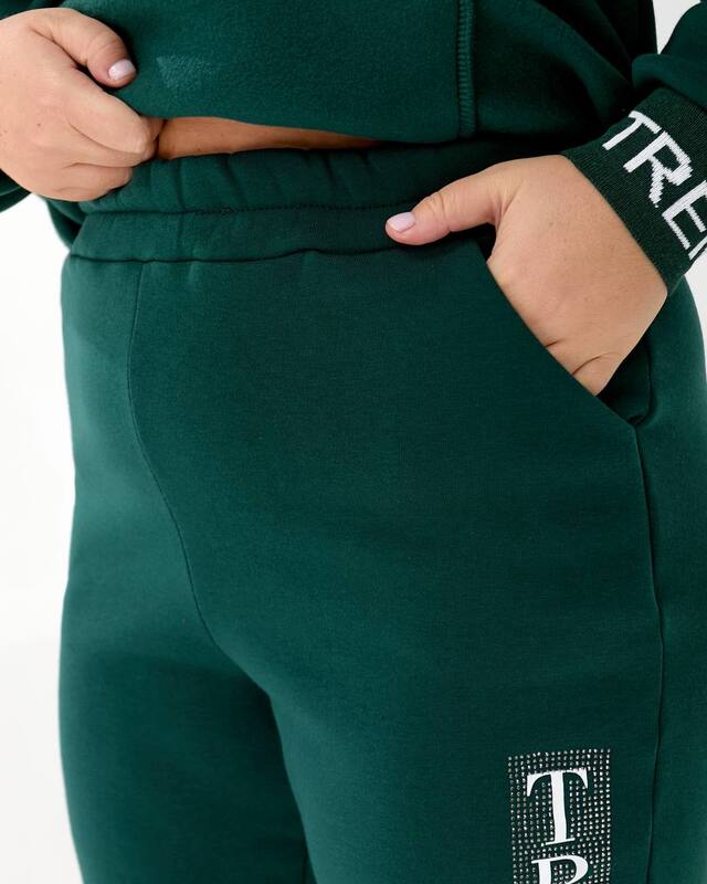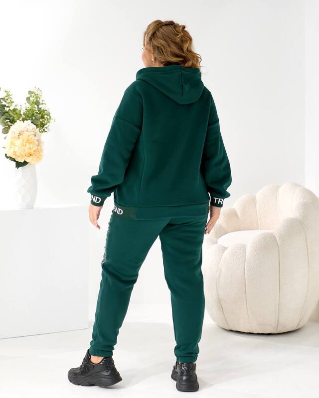 Глубокий зелёный оттенок делает костюм особенно стильным: цвет смотрится роскошно, гармонично и подчёркивает элегантность спортивного образа. Модель легко сочетать с демисезонной и зимней обувью, пуховиками, жилетами и верхней одеждой в базовой палитре.