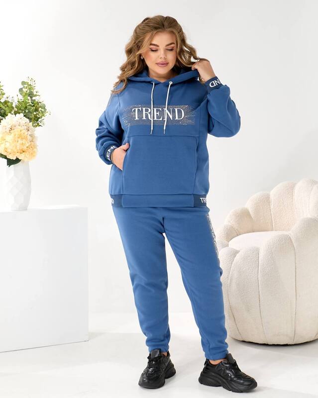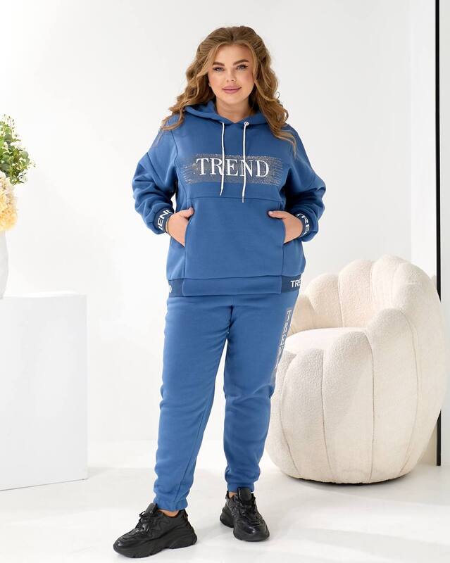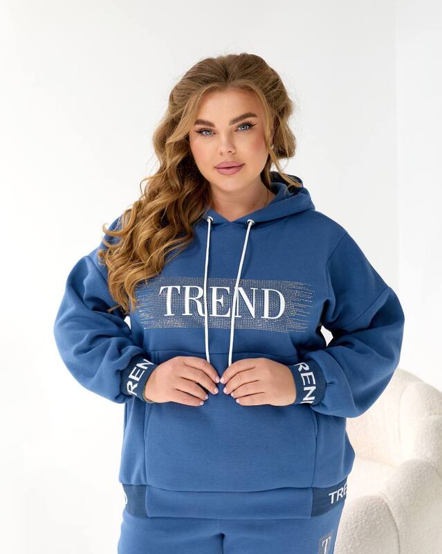 Верхняя часть комплекта представляет собой уютное худи оверсайз с глубоким капюшоном. Он обеспечивает защиту от ветра и холода, а свободный крой дарит полный комфорт и подходит для любого типа фигуры. Центральный элемент дизайна — крупный акцентный принт TREND, украшенный мерцающими блестящими элементами. Эти детали добавляют образу яркости, создают динамику и подчеркивают современный стиль модели. Мягкие манжеты на рукавах помогают удерживать тепло и поддерживают аккуратную форму изделия.