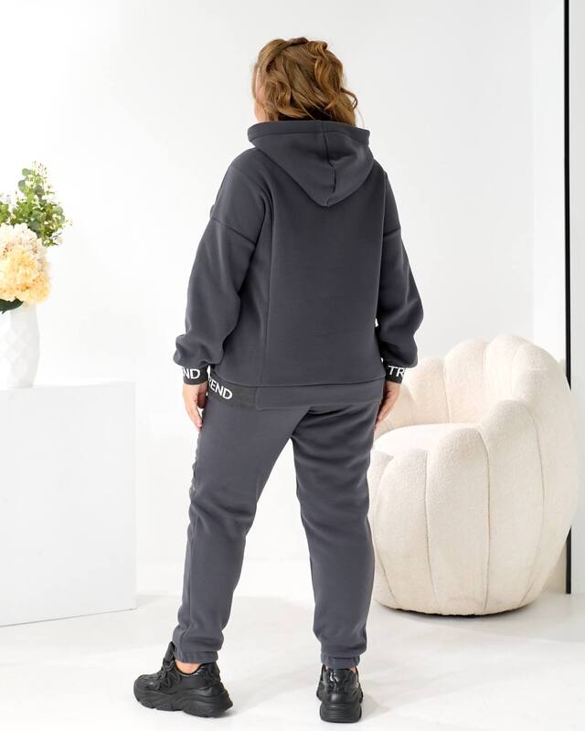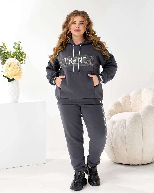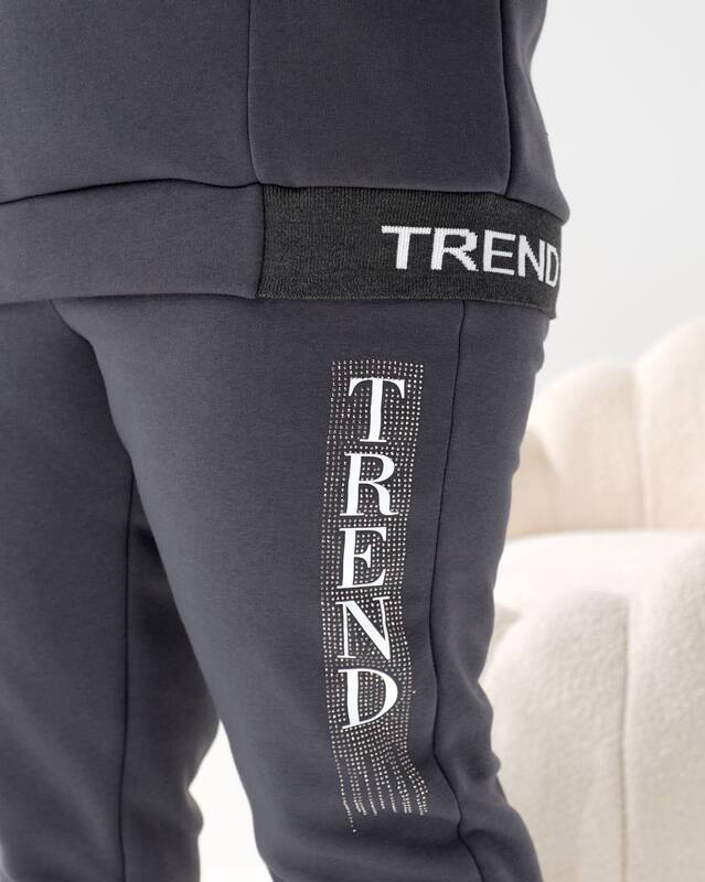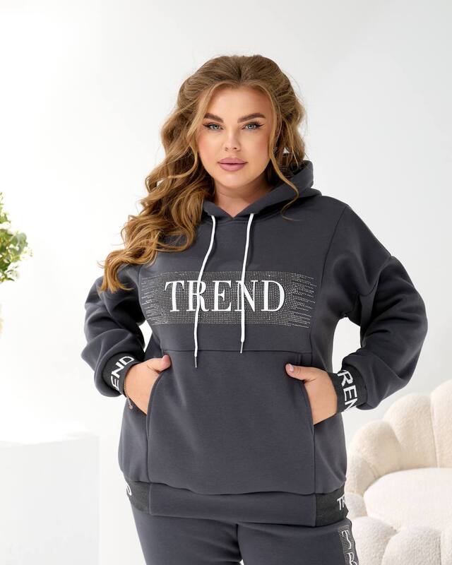 Верхняя часть комплекта — объёмное худи оверсайз с капюшоном. Капюшон обеспечивает дополнительную защиту от ветра и холода, а свободный крой создаёт расслабленный современный силуэт, подходящий для любого типа фигуры. Особый акцент — крупный принт TREND, украшенный мерцающими блестящими элементами, которые подчёркивают стильность модели и добавляют лёгкое сияние. Такие яркие детали делают образ более выразительным и модным, сохраняя при этом универсальность и практичность. Манжеты на рукавах помогают удерживать тепло и формируют аккуратный вид изделия.