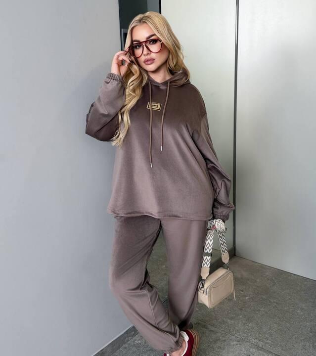 Этот спортивный костюм — идеальный вариант, когда хочется выглядеть ухоженно и современно, но при этом чувствовать максимальный комфорт в течение всего дня. Комплект выполнен из велюра: ткань мягкая, приятная к телу, с выразительной фактурой, которая смотрится аккуратно и «дороже» обычного трикотажа. Велюр красиво ложится, создаёт ровный силуэт и помогает образу оставаться опрятным даже при активном ритме — будь то прогулка, дорога, домашние дела или встреча в городе.