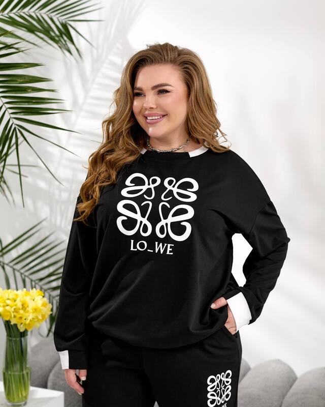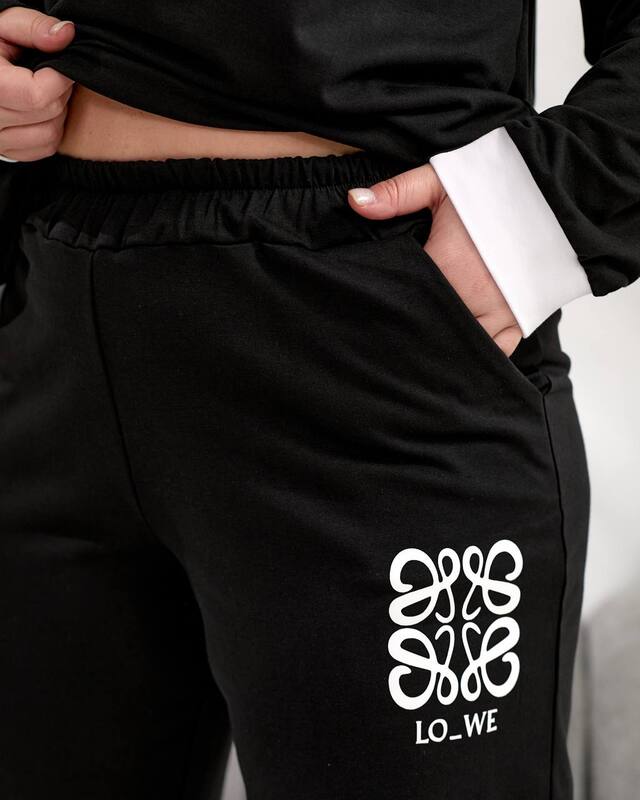 Верх выполнен в свободном оверсайз крое, благодаря чему мягко ложится по фигуре, не стесняет движений и дарит ощущение легкости в течение всего дня. Круглая горловина делает модель универсальной, а длинные рукава добавляют образу завершенность и уют. Яркий акцент комплекта — контрастный принт LO_WE на передней части, который придает модели характер и делает ее более заметной. Светлая отделка манжет и нижней части рукавов освежает общий вид и подчеркивает продуманность дизайна.