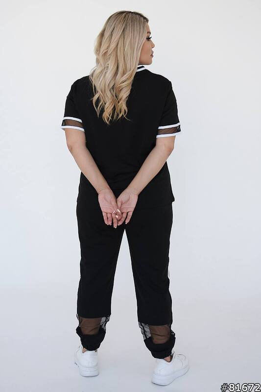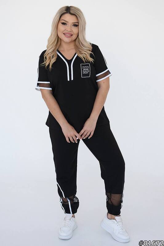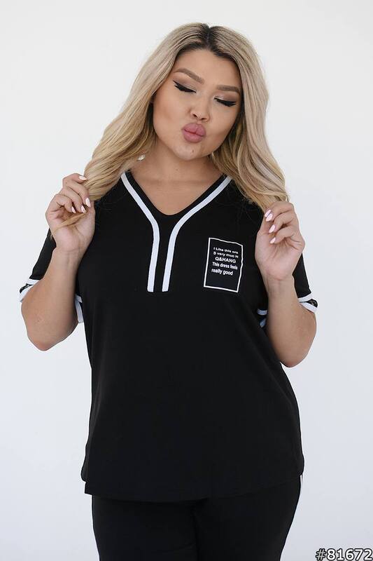 Верх выполнен в прямом удобном крое с V-образным вырезом, короткими рукавами и аккуратными контрастными акцентами, которые делают модель более выразительной и современной. Брюки удобной длины, с комфортной посадкой и заужением к низу, благодаря чему костюм смотрится собранно и стильно. Такой комплект легко подойдет для прогулок, повседневных дел, поездок, отдыха и встреч в неформальной обстановке. Особенно удачный выбор для тех, кто ценит большие размеры, свободу движений и готовый образ, который не нужно долго подбирать по отдельности.