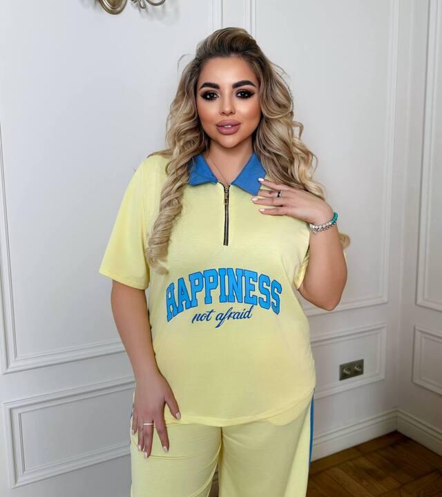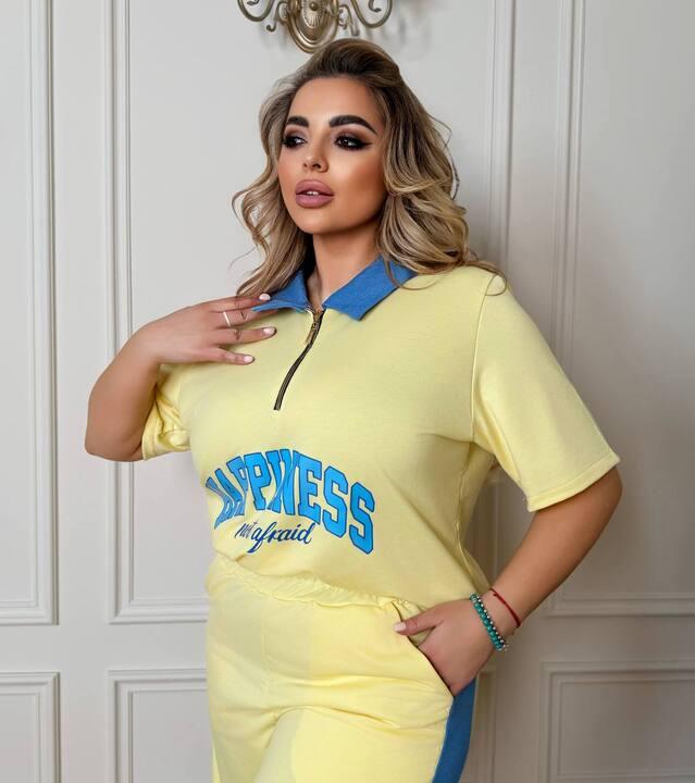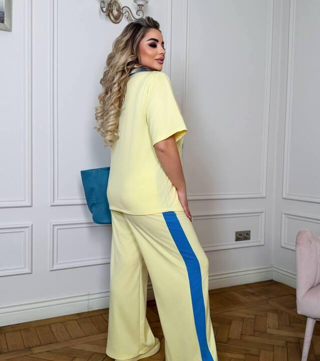 Комплект состоит из свободного верха и брюк. Верх выполнен в расслабленном крое, за счет чего красиво сидит по фигуре, не сковывает движения и создает ощущение легкости. Модель выглядит интересно и выразительно благодаря контрастным акцентам в зоне воротника и декоративной надписи спереди, которые делают комплект более заметным и стильным. Короткий рукав добавляет комфорта и делает костюм особенно удобным для повседневной носки. Брюки выполнены в свободном прямом крое, поэтому красиво вытягивают силуэт, комфортно садятся и хорошо подходят для ежедневного использования.