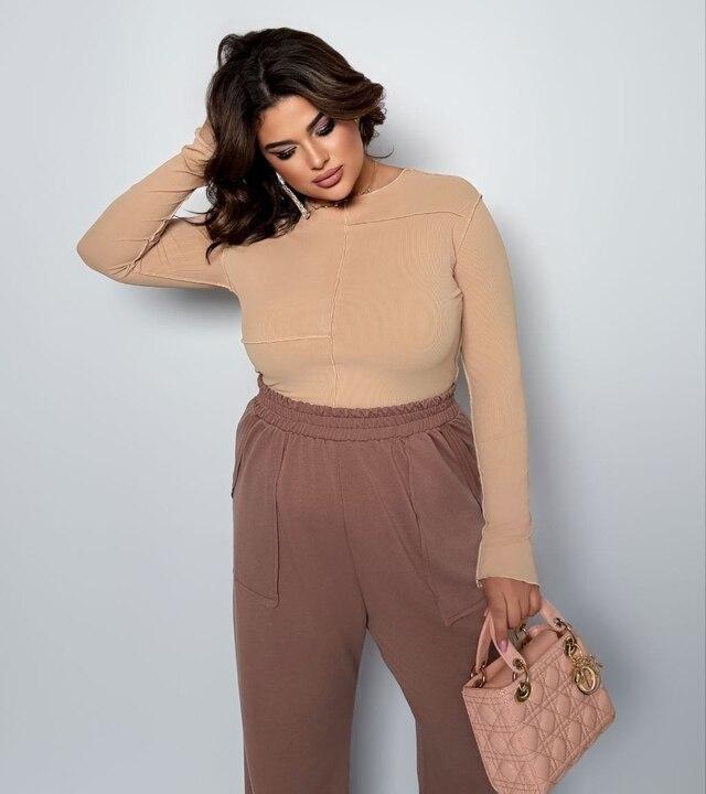 Для верха использован бельевой трикотаж люкс качества — мягкий, приятный к телу и комфортный материал, который хорошо ложится по фигуре и отлично подходит для активного повседневного ритма. Брюки выполнены в спортивном стиле и поддерживают общую концепцию комплекта благодаря эффекту необработанных краев. Пояс на резинке делает посадку удобной и практичной, а функциональные карманы спереди добавляют еще больше комфорта в повседневной носке. Свободный крой брюк визуально вытягивает силуэт и помогает создать расслабленный, но аккуратный образ.