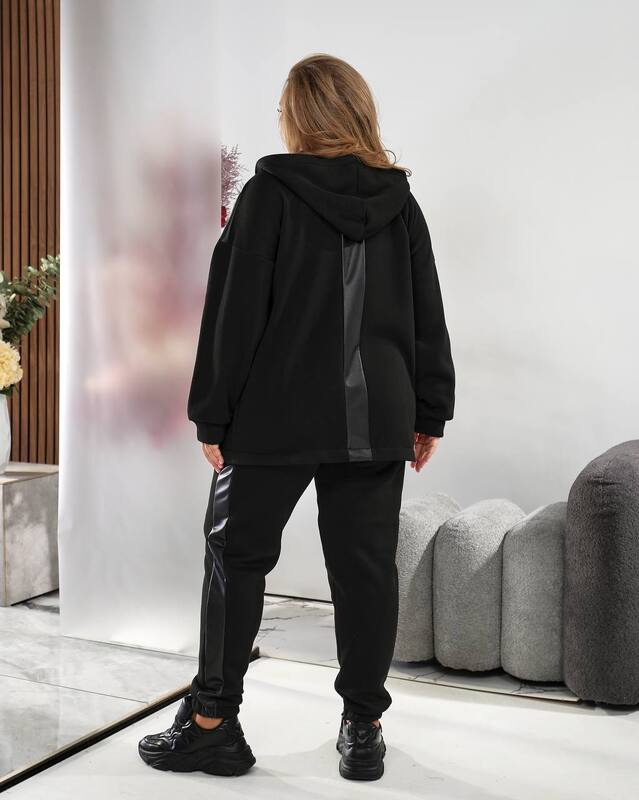 Такой спортивный костюм станет отличным выбором для прохладной осени. Он прекрасно вписывается в повседневные образы, сочетая в себе тепло, комфорт и стиль. Вставки из эко-кожи добавляют элегантности и подчеркивают современный характер модели. Это идеальный вариант для женщин, которые ценят практичность и одновременно хотят выглядеть уверенно и модно.