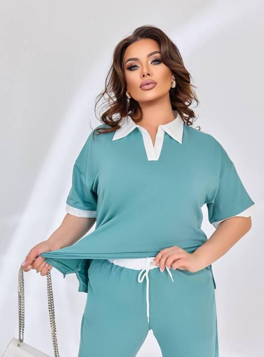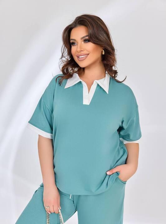 Верх выполнен в формате свободной футболки с коротким рукавом и аккуратным воротником, что делает модель особенно интересной и заметно выделяет ее среди более обычных прогулочных комплектов. Такой фасон выглядит свежо, современно и женственно, а сам воротник придает образу более собранный и выразительный характер. Футболка красиво садится, не сковывает движения и позволяет чувствовать себя легко в течение всего дня. Контрастная отделка воротника и рукавов делает модель визуально более выразительной и добавляет комплекту стильный акцент.