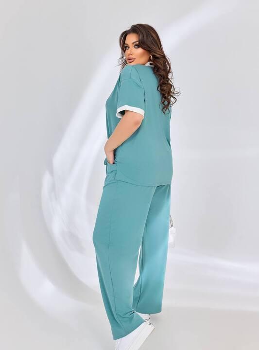 Брюки свободного кроя отлично дополняют верх и создают комфортный, расслабленный силуэт, который остается аккуратным и гармоничным. Такой фасон особенно удобен для повседневной носки, так как он не ограничивает движения и позволяет чувствовать себя уверенно в любой ситуации. Комплект хорошо смотрится как полноценный готовый образ, который не требует сложного подбора вещей и уже выглядит завершенно.