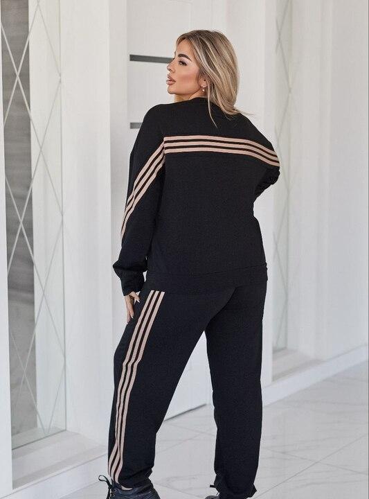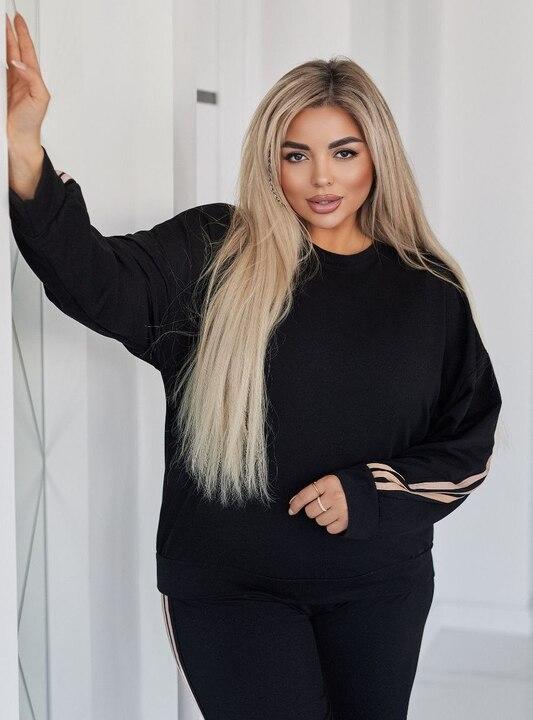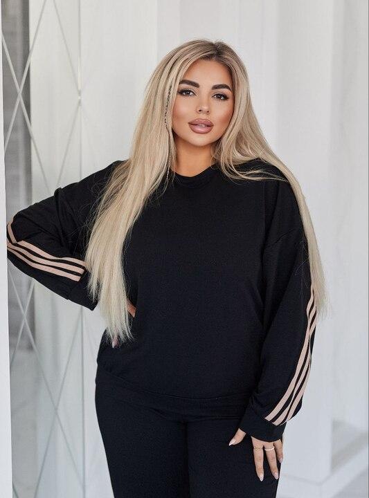 Верх выполнен в формате свободного свитшота с круглой горловиной и длинными рукавами. Благодаря мягкой посадке модель не сковывает движения и обеспечивает комфорт в течение всего дня. Свитшот выглядит современно и расслабленно, а декоративные лампасы на рукавах делают образ более выразительным, динамичным и стильным. Такой элемент добавляет спортивному костюму характер и делает его заметнее, сохраняя при этом универсальность и удобство.