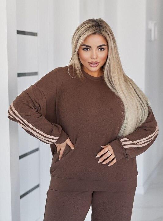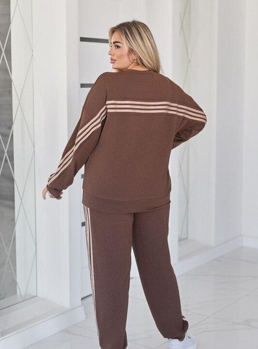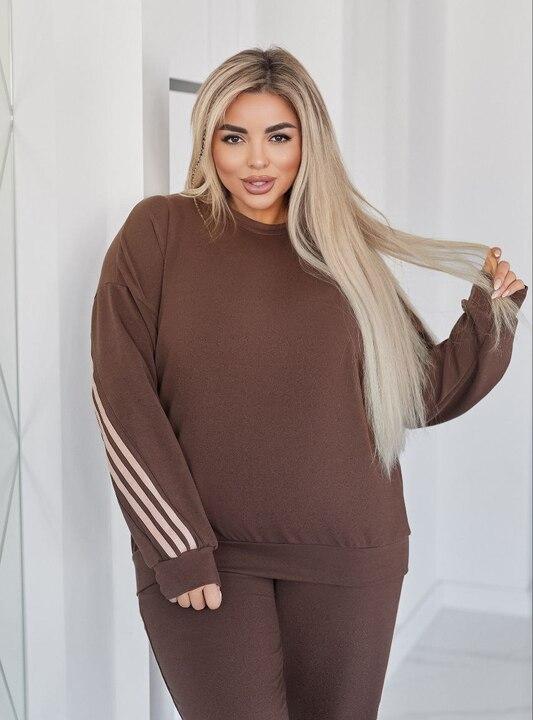 Верх выполнен в формате свободного свитшота с круглой горловиной и длинными рукавами. Благодаря мягкой посадке модель не сковывает движения и обеспечивает комфорт в течение всего дня. Свитшот выглядит современно и расслабленно, а декоративные лампасы на рукавах делают образ более выразительным, динамичным и стильным. Такой элемент добавляет спортивному костюму характер и делает его заметнее, сохраняя при этом универсальность и удобство.