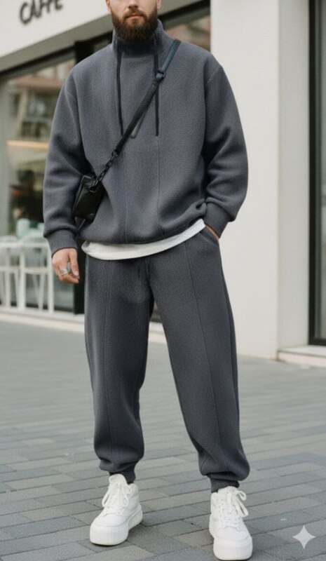 Мужской спортивный костюм из мягкого полар-флиса — это воплощение комфорта и современного минимализма. Комплект состоит из свободной кофты с высоким воротником и брюк с манжетами, выполненных из плотного, но лёгкого флисового материала. Полар-флис отличается исключительными термоизоляционными свойствами: он отлично удерживает тепло, позволяя телу «дышать», не вызывает раздражений и обеспечивает приятное ощущение мягкости при носке. Благодаря структуре ткани костюм не деформируется, не скатывается и сохраняет аккуратный внешний вид даже после частых стирок.