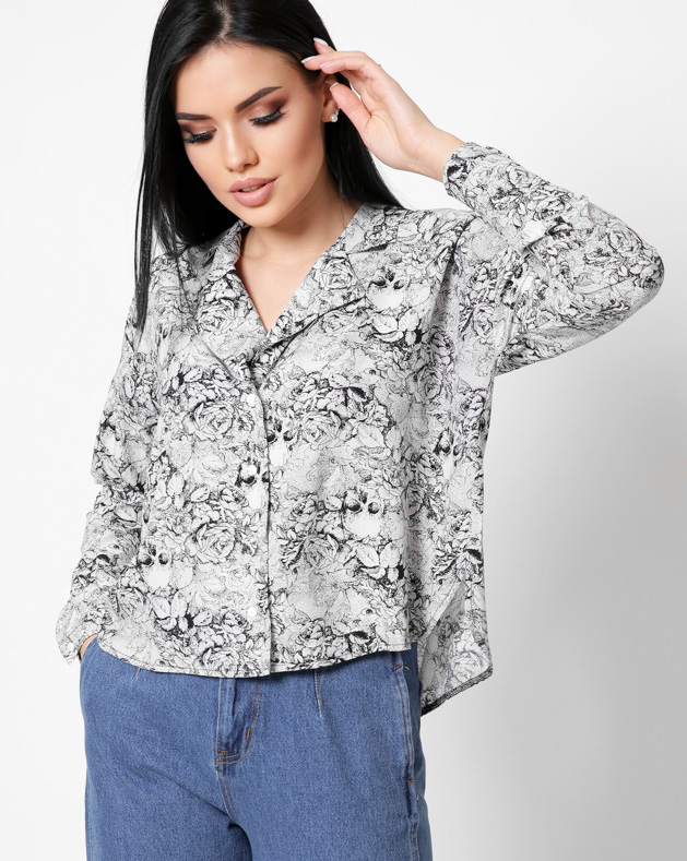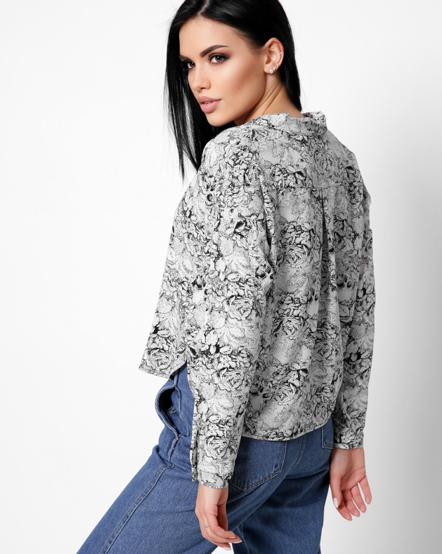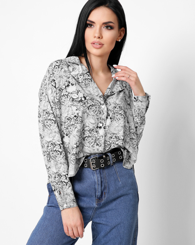 Оверсайз блузка сделана из суперсофта. Воротник стойка. Небольшие разрезы по бокам. Уникальный цветочный принт по всей ткани. Прекрасно сочетается с джинсами на высокой талии.