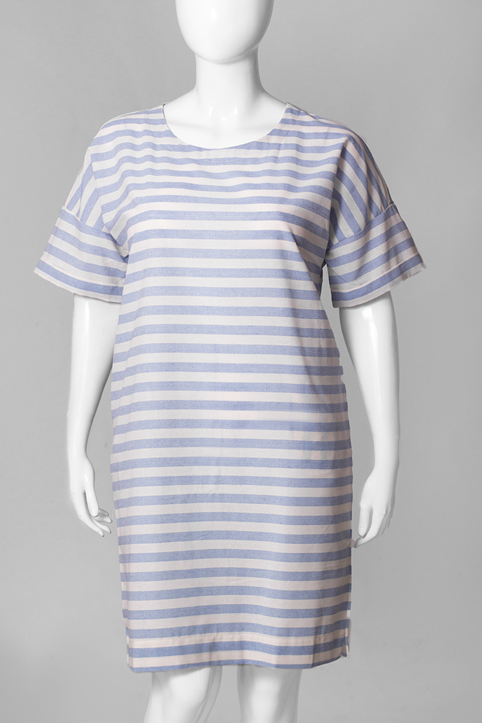 Платье прямого силуэта с коротким рукавом, рукав с отворотом. В боковых швах – карманы, внизу – маленькие разрезики