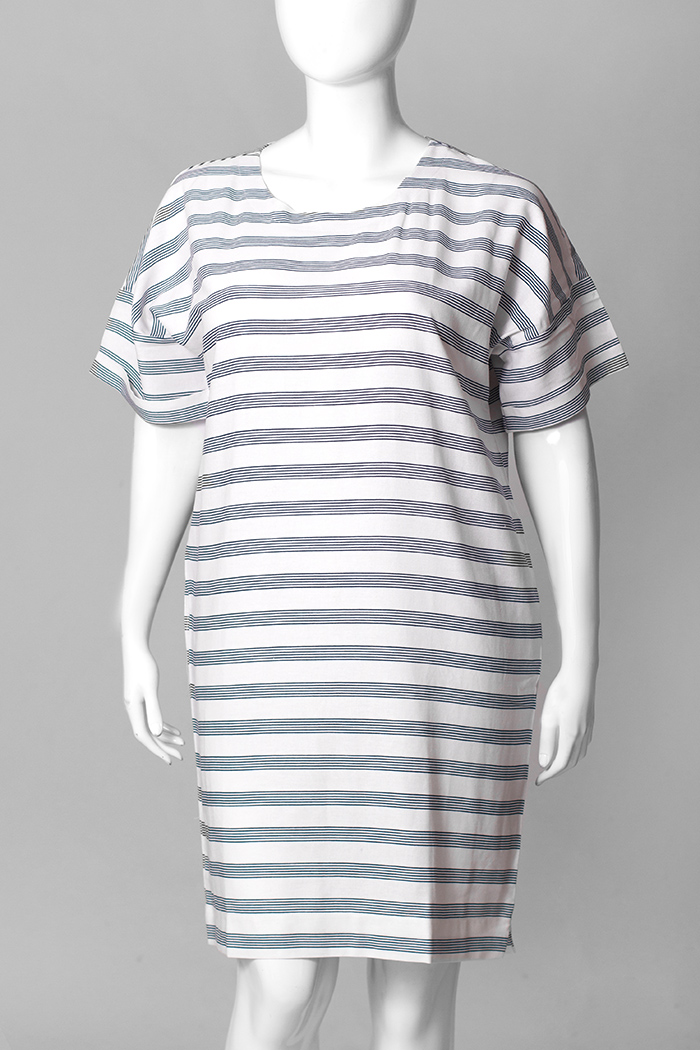 Платье прямого силуэта с коротким рукавом, рукав с отворотом. В боковых швах – карманы, внизу – маленькие разрезики