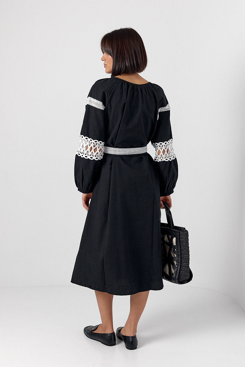 Жіноча сукня міді зі вставками макраме — витончений і романтичний вибір для особливих моментів. Виготовлена з натуральної бавовни, вона забезпечує комфорт і легкість у носінні.