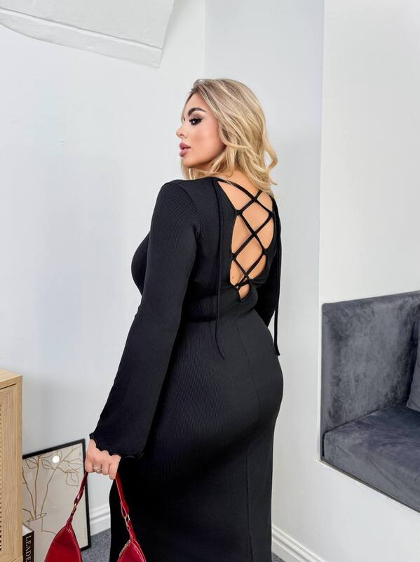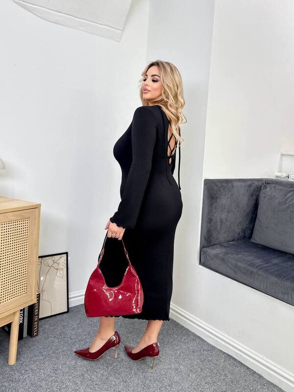 Платье имеет длину миди, что делает его универсальным решением для осенне-зимнего сезона. Облегающий крой визуально вытягивает фигуру и делает образ стройным и женственным. Длинные рукава и круглая горловина придают модели лаконичность, а декоративная шнуровка на спине добавляет изюминку и делает акцент на изящности силуэта. Такое платье станет основой для множества стильных образов — достаточно добавить каблуки и аксессуары для выхода или сочетать с ботинками и пальто для повседневного лука.