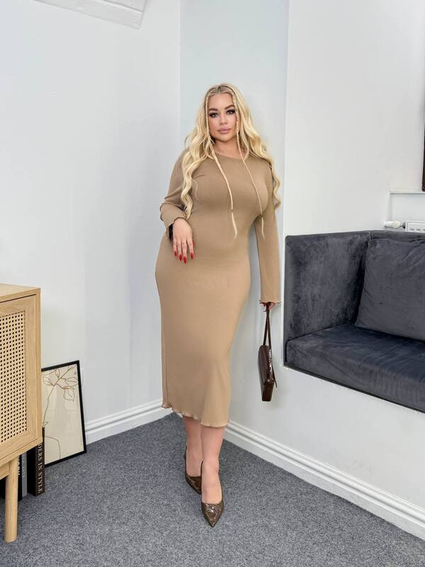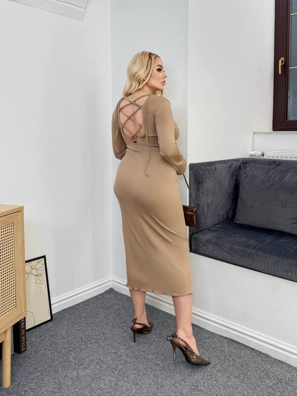 Платье имеет длину миди, что делает его универсальным вариантом как для повседневных образов, так и для вечера. Облегающий фасон визуально вытягивает фигуру, а декоративная шнуровка на спине добавляет изюминку и лёгкий акцент на женственность. Длинные рукава и высокая горловина создают уютное ощущение, идеально подходящее для осенне-зимнего сезона. Платье отлично сочетается с жакетами, пальто или куртками, а также с обувью на каблуке или ботинками, позволяя создавать разные стильные образы.