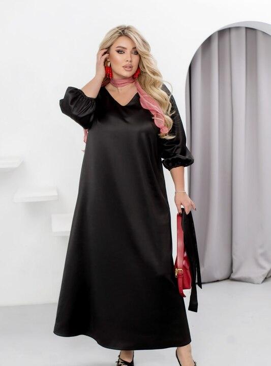 Прямой макси-силуэт формирует элегантные пропорции и подчёркивает женственность фигуры. Неглубокий V-образный вырез аккуратно выделяет зону декольте, добавляя образу изящества и утончённости без излишней откровенности. Рукава длиной три четверти с мягкой фиксацией на резинке обеспечивают удобство и свободу движений, делая модель практичной и комфортной.