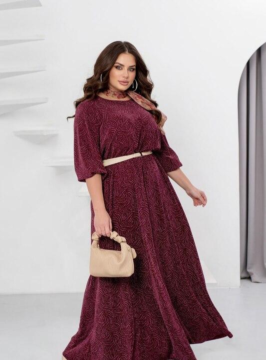 Рукава длиной три четверти с мягкими резинками на запястьях добавляют объём и визуальный баланс силуэту, сохраняя комфорт и свободу движений. В комплект входит пояс, который позволяет акцентировать талию и завершить образ, делая его более выразительным и собранным. Это платье станет отличным выбором для праздничных вечеров, торжественных событий и особых моментов, когда хочется выглядеть по-настоящему эффектно, уверенно и элегантно.