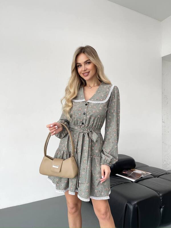 Отзывы о Платье-трапеция женское из шелковистого софта мини с длинным рукавом на резинке с поясом и интересным воротником весенне-летнее k-129029