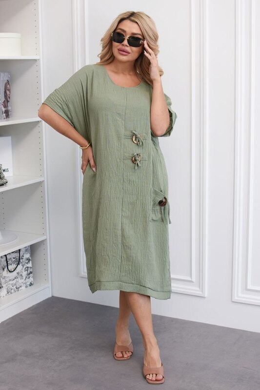 Свободный силуэт делает эту модель особенно универсальной. Платье хорошо смотрится на разных типах фигуры, мягко скрывает нюансы и создает расслабленный, но аккуратный образ. Короткий рукав добавляет удобства и делает модель практичной для весенне-летнего гардероба. Карманы и декоративные пуговицы формируют завершенный вид изделия, делают его выразительнее и добавляют приятный современный акцент без перегруженности.