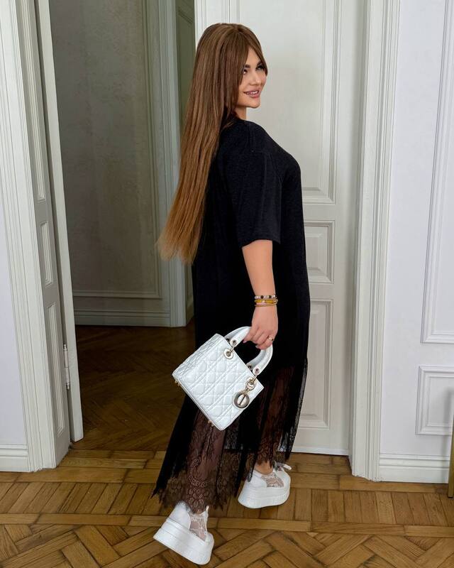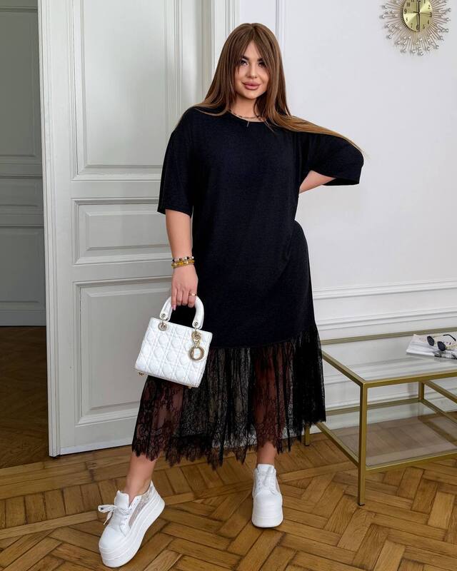 Свободный крой делает модель особенно комфортной в носке, мягко обыгрывает фигуру и не сковывает движения. Верх выглядит лаконично и универсально, поэтому платье легко сочетать с кедами, кроссовками, босоножками и различными аксессуарами. Нижняя часть украшена кружевом, благодаря чему образ становится более нежным, выразительным и женственным. Эта деталь красиво оживляет модель и делает ее не просто повседневной, а действительно заметной и стильной.