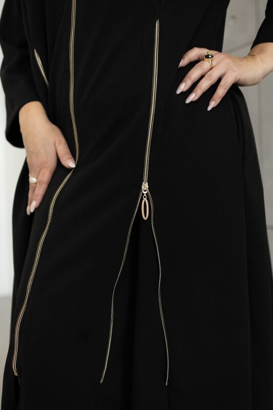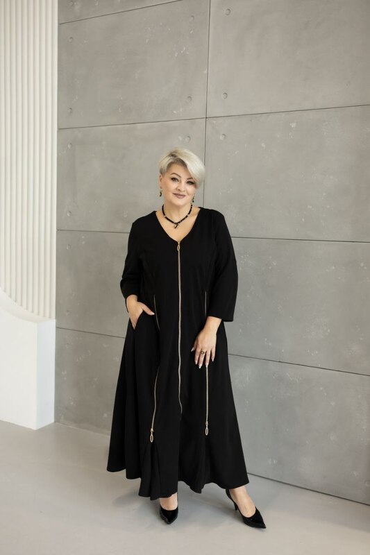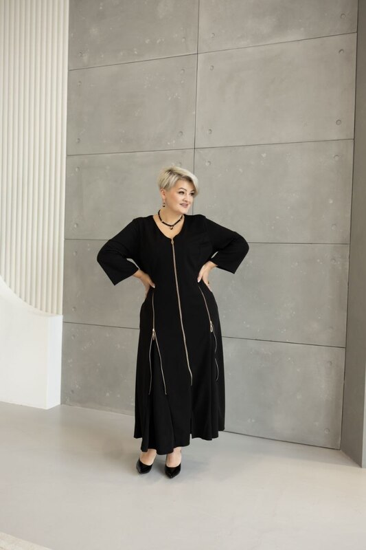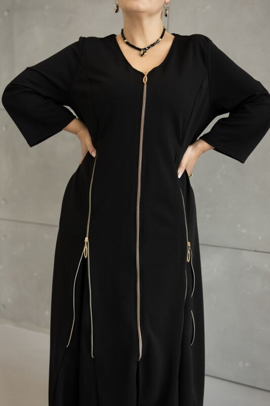 Главная выразительная деталь — вертикальные декоративные молнии, которые визуально стройнят силуэт и добавляют платью современный акцент. В зоне бедер молнии можно регулировать, меняя свободу посадки и комфорт под свои параметры. Рукав также регулируется патами, что делает модель более практичной и удобной.