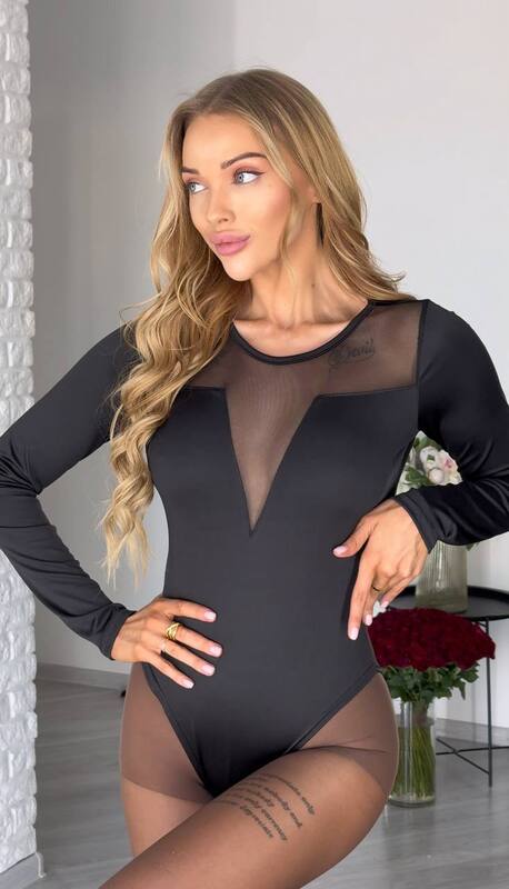 Модель выполнена в облегающем крое, который красиво подчеркивает фигуру, делает линии более выразительными и помогает создать аккуратный, подтянутый силуэт. Длинные рукава уравновешивают образ и добавляют ему элегантности, а прозрачные вставки из трикотажной сетки делают дизайн особенно эффектным. За счет такого решения боди выглядит не просто базово, а действительно интересно, современно и соблазнительно. Полупрозрачная зона в верхней части создает красивый акцент, визуально вытягивает линию шеи и придает образу особую изящность.