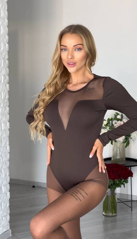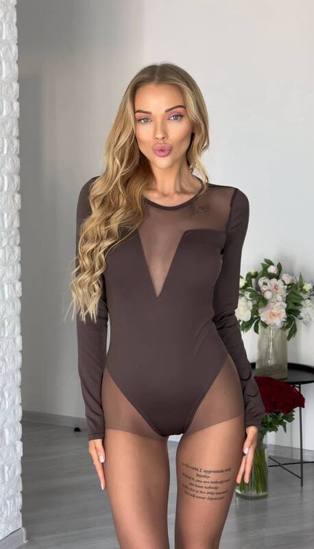 Облегающий силуэт красиво подчеркивает фигуру, делает линии более четкими и помогает сформировать аккуратный, собранный образ. Длинные рукава добавляют модели элегантности и визуально уравновешивают более акцентный верх. Прозрачная вставка из трикотажной сетки в зоне декольте и плеч делает дизайн особенно выразительным, добавляет образу легкость, изящность и ту самую эффектность, которая сразу выделяет изделие среди базовых моделей. За счет такого решения боди выглядит не просто красиво, а действительно стильно и дорого.