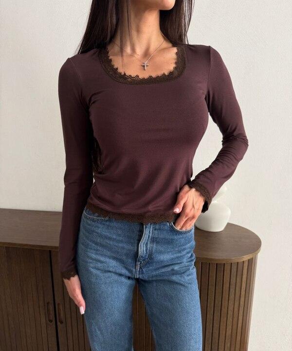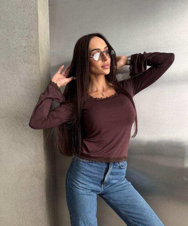 Особую выразительность модели придает квадратный вырез, который красиво подчеркивает линию шеи и делает силуэт визуально более изящным. Отделка кружевом по вырезу, рукавам и нижнему краю добавляет образу романтичности, нежности и деликатной женственности. Такие детали делают лонгслив заметно интереснее, но при этом не перегружают его. Рукава, немного расширенные к низу, смотрятся легко и элегантно, добавляют образу плавности и делают модель еще более привлекательной.