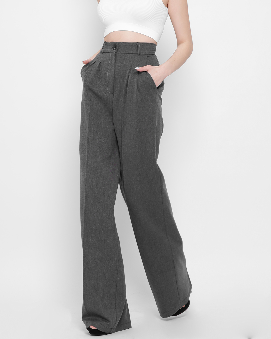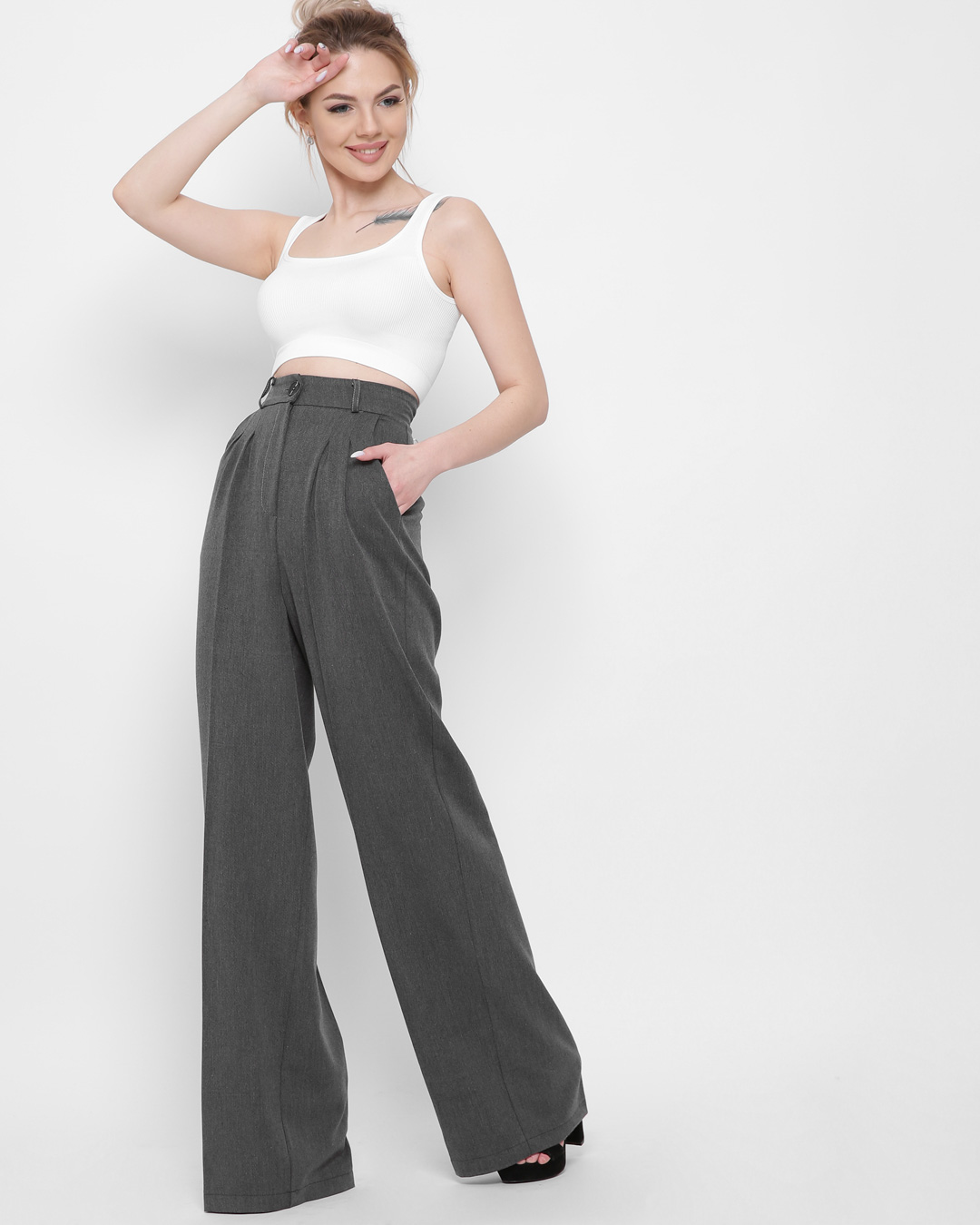 Однотонные брюки-палаццо. Отличный выбор на лето, даже в жаркую погоду девушка будет чувствовать себя комфортно. Высокая талия, широкие штанины, что сделает движения более свободными. Подойдет обладательницам высокого роста (или рекомендуем совмещать с высоким каблуком).