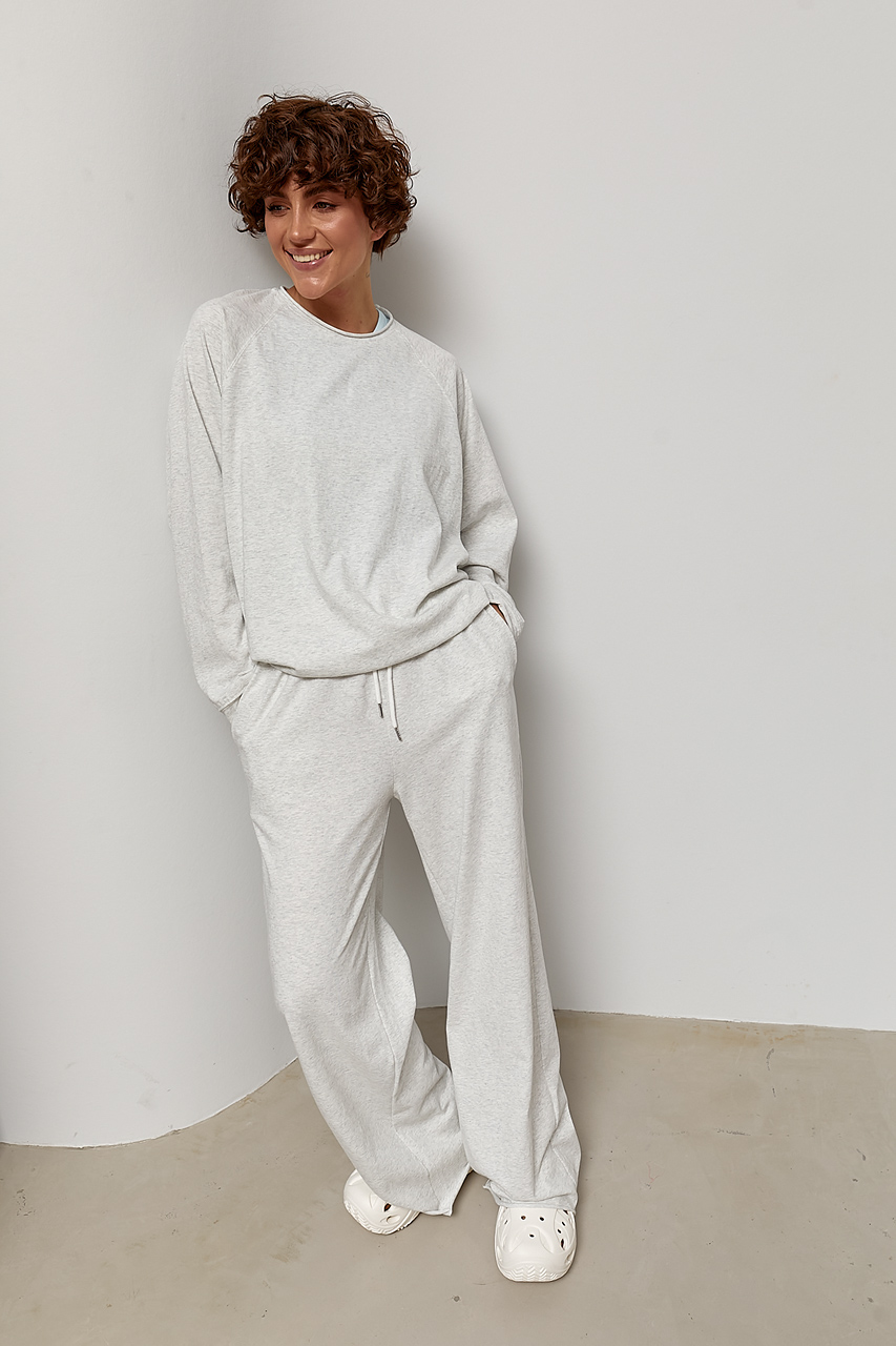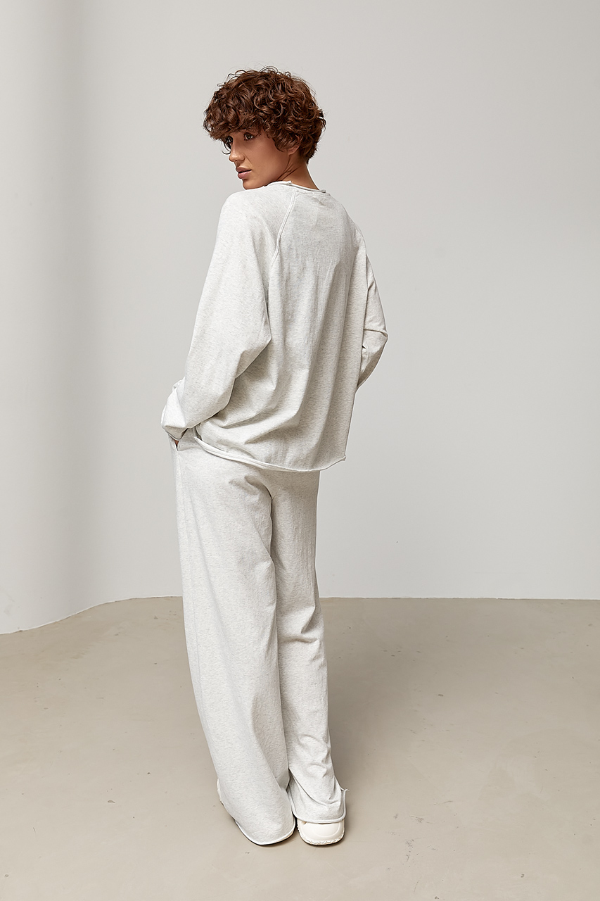 Трикотажний однотонний костюм із лонгом та штанами палаццо — комфортна та стильна модель у сучасному розслабленому стилі. Лаконічний дизайн і м’який трикотаж роблять комплект ідеальним для повсякденного носіння, а необроблені краї додають образу трендової недбалості.