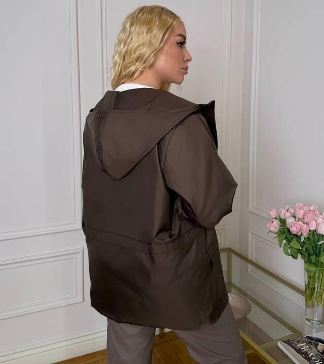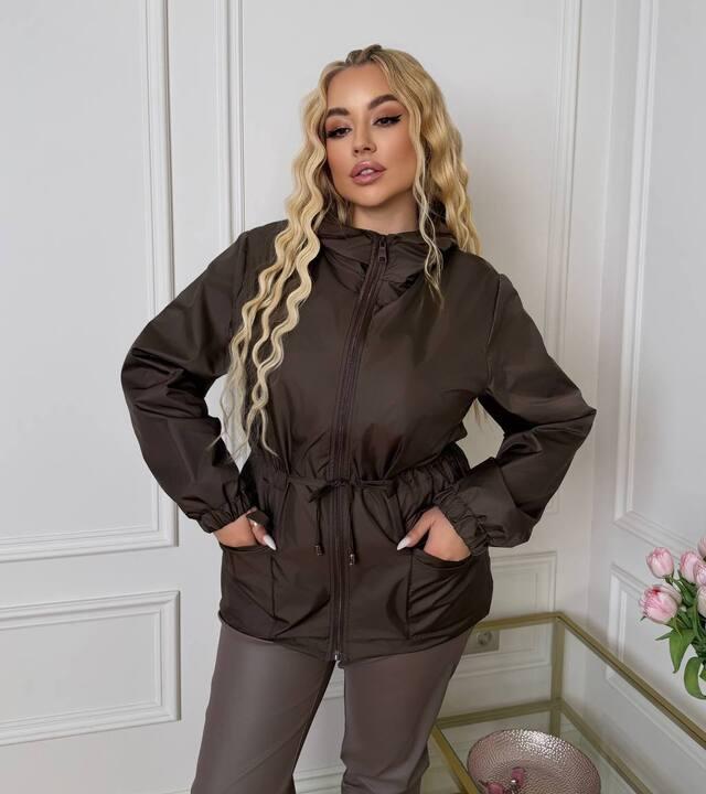 Ветровка женская удлинённая весенняя из плащевки с капюшоном на молнии с карманами и кулиской по талии  k-128707