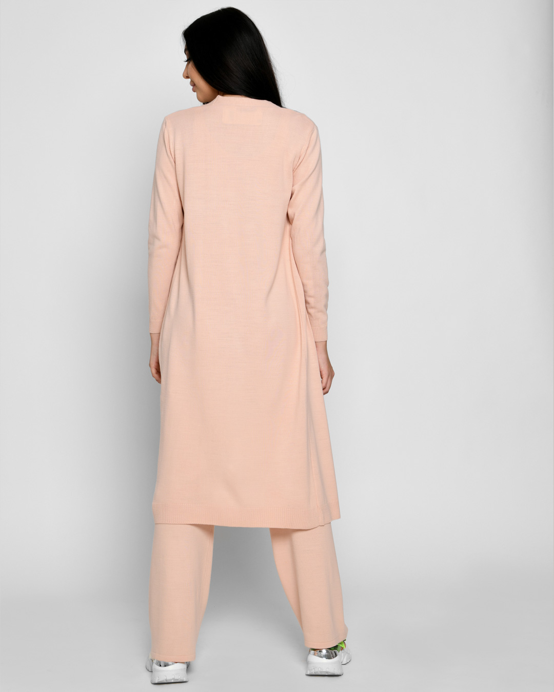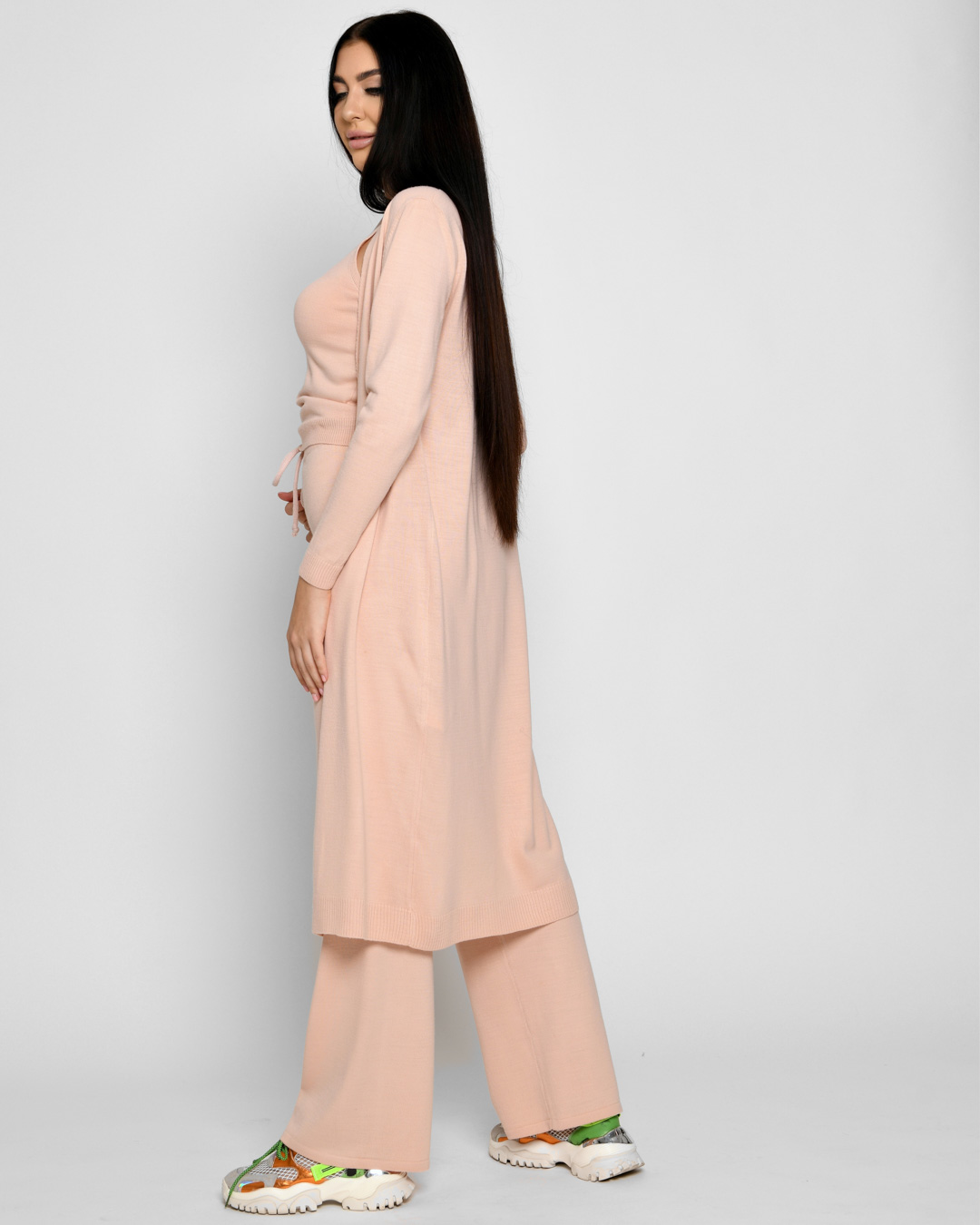 Доступные размеры :[ONE SIZE] Размер ONE SIZE:Рост модели:175 смДлина внешнего шва:106Длина внутреннего шва:72Длина изделия:100Длина рукава:56Обхват груди:68Элегантный вязаный костюм-тройка, который состоит из майки, штанов и кардигана. Майка имеет п.. Читать полностью