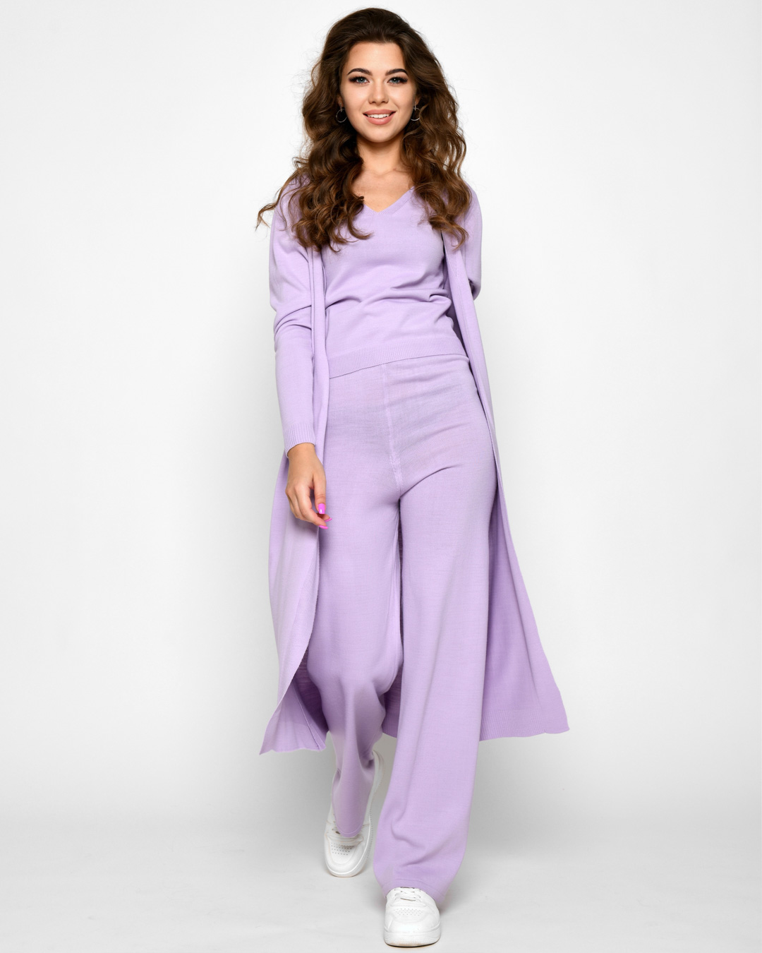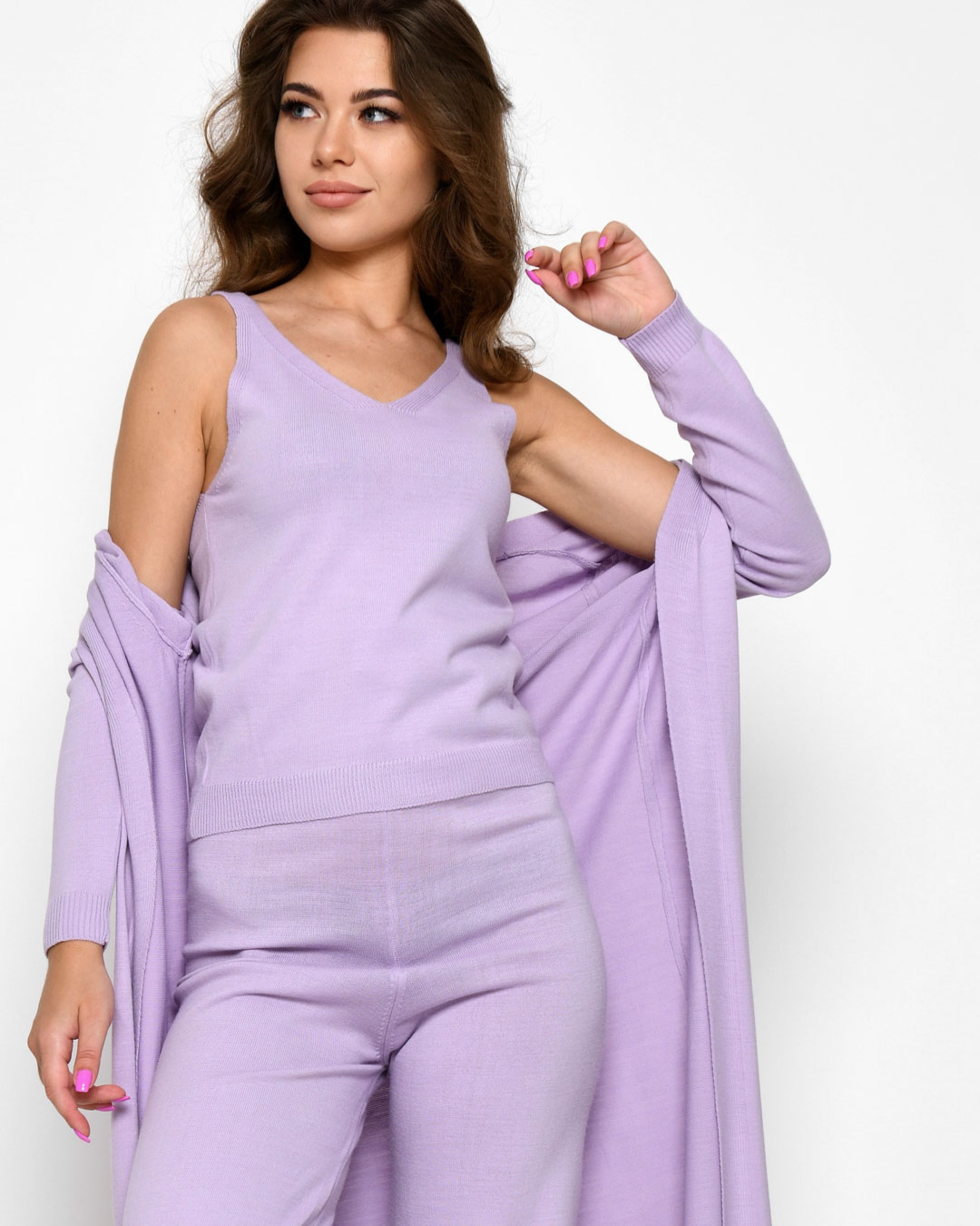 Доступные размеры :[ONE SIZE] Размер ONE SIZE:Рост модели:167 смДлина внешнего шва:106Длина внутреннего шва:72Длина изделия:100Длина рукава:56Обхват груди:68Элегантный вязаный костюм-тройка, который состоит из майки, штанов и кардигана. Майка имеет п.. Читать полностью