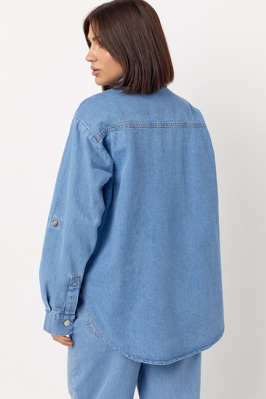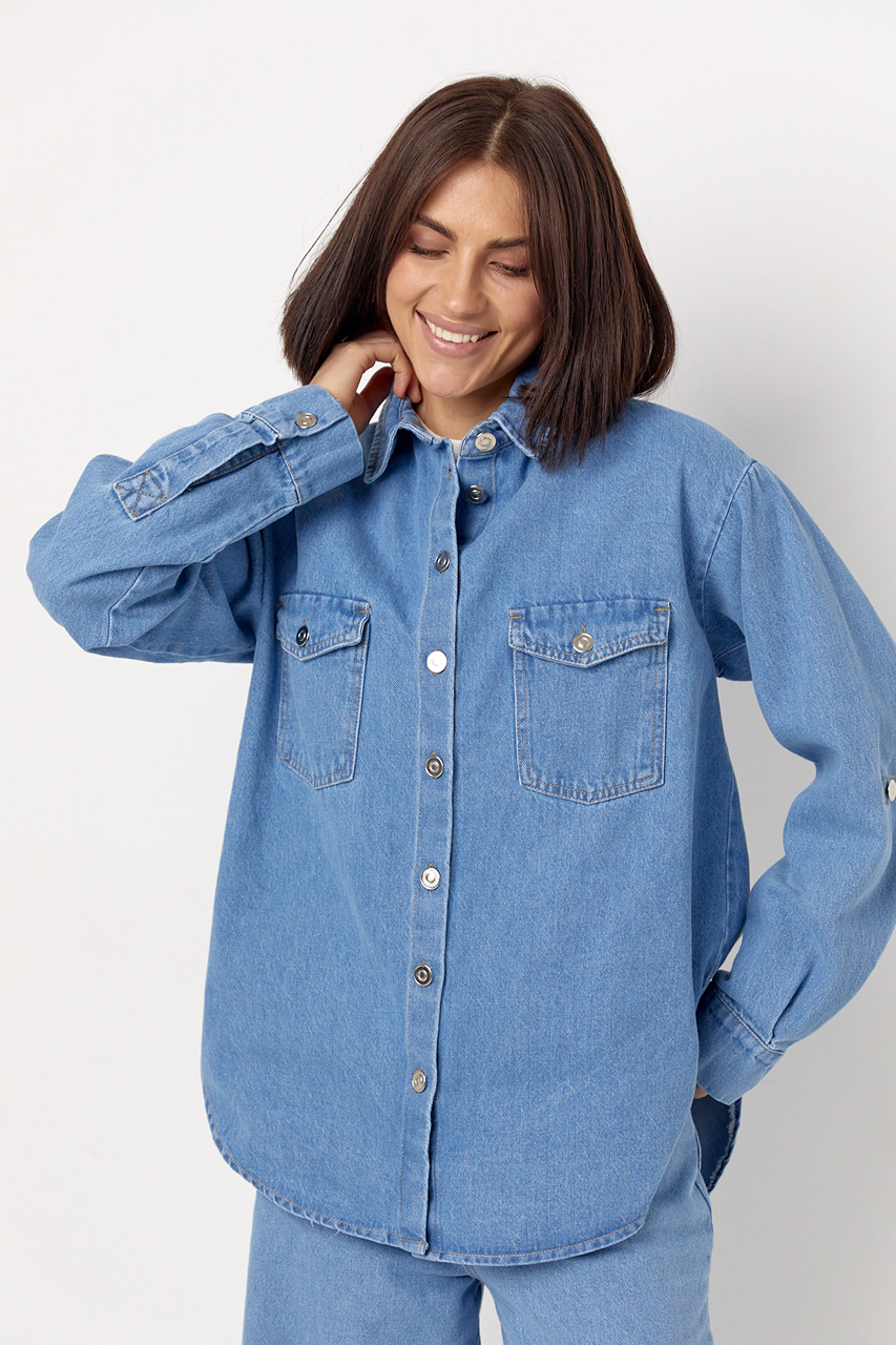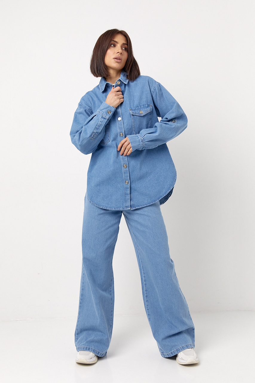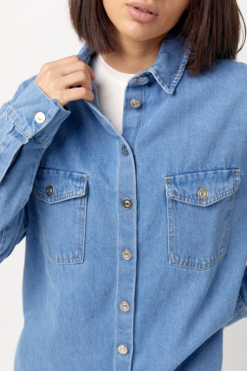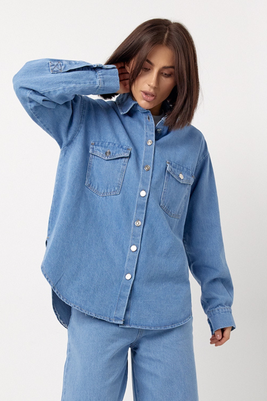 Доступные размеры :[XL] Размер XL:Довжина переду виробу, см: 75смДовжина рукава від горловини, см: 82смШирина під проймами рукавів (над грудьми), см: 65смДовжина рукава по внутрішньому шву, см: 57смЖіноча джинсова сорочка на ґудзиках — це універсальн.. Читать полностью