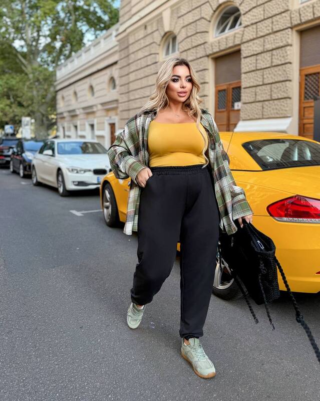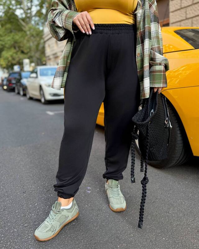 Фасон выполнен в спортивном стиле с высокой посадкой и эластичной резинкой на талии, что делает брюки максимально удобными для повседневного ношения. Длина по внешнему шву 102–106 см при росте модели 170 см обеспечивает идеальную посадку. Манжеты на штанинах добавляют аккуратности силуэту и подчеркивают современный крой.