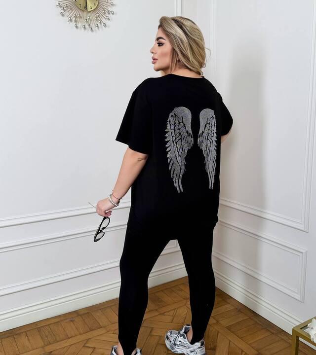 Главная особенность изделия — крупный декоративный рисунок из страз на спинке в виде крыльев. Такой декор сразу делает футболку более выразительной и превращает ее из простой базовой вещи в полноценный акцент гардероба. Рисунок смотрится эффектно, заметно и добавляет образу характер. Именно такие детали помогают сделать даже повседневный комплект более интересным, современным и запоминающимся.