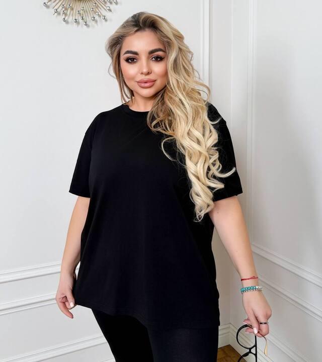 Удлиненная длина делает модель особенно удобной в носке и дает больше вариантов для сочетаний. Футболка хорошо смотрится с леггинсами, джинсами, брюками, шортами и спортивными вещами. Ее можно носить как самостоятельный акцент в образе, не перегружая комплект дополнительными деталями. Это удачный выбор для женщин, которые ищут комфортную, современную и визуально интересную футболку большого размера с модным свободным силуэтом и эффектным декоративным оформлением. Такая модель легко станет любимой вещью на каждый день благодаря удобству, красивой посадке и заметному дизайну.