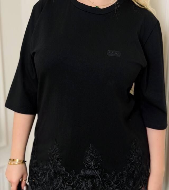 Главная изюминка этой модели — декоративное кружево по нижнему краю. Оно добавляет изделию женственности, аккуратной выразительности и делает обычную футболку более нарядной и заметной. Благодаря этой детали модель выглядит не просто базовой, а действительно стильной и актуальной. Круглый вырез и короткий рукав делают фасон универсальным, поэтому такую футболку легко сочетать с джинсами, брюками, лосинами, юбками и различными вариантами обуви.
